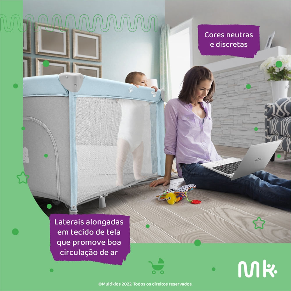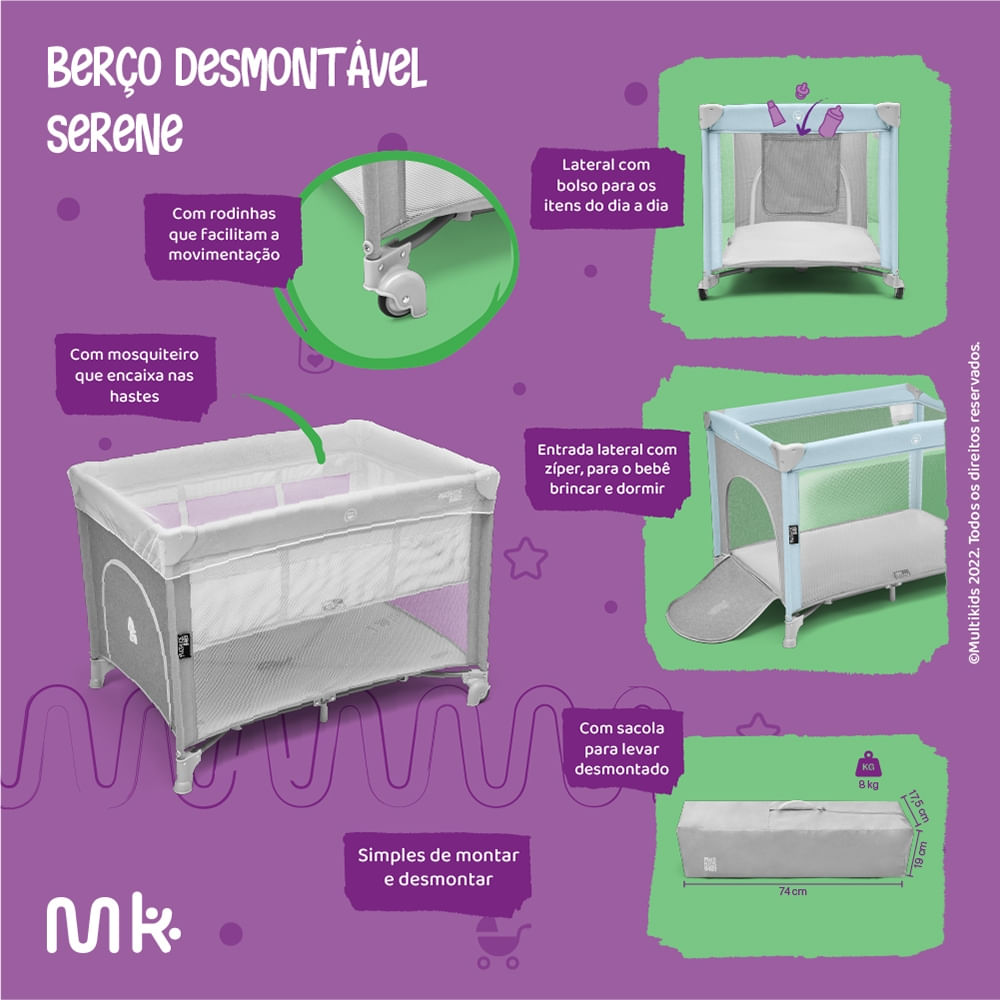 A linha de Berços Desmontáveis da MultikidsBaby chegou para trazer segurança para os bebês e tranquilidade para os pais! O Berço portátil Serene além de leve e compacto, é super fácil de carregar e vem com uma sacola feita especialmente para ajudar no transporte. Ideal para levar em viagens, ele é leve e fácil de carregar ou armazenar. Desenvolvido em formato retangular, ele conta com laterais alongadas cobertas por tecido de tela permitindo uma boa visibilidade para o seu bebê garantindo na boa circulação do ar. Com duas alturas reguláveis e ajustáveis, o berço desmontável acompanha o crescimento do seu bebê. As duas bases frontais são apoiadas em rodinhas que ajudam na hora de movimentar quando montado. Com bolso lateral para deixar os principais itens à mão e entrada lateral com zíper, o Serene é prático e pode ser usado também durante o dia, para deixar seu bebê brincando. Desenvolvido em cores neutras e discretas, o Serene combina com qualquer ambiente. Seu colchão macio é revestido em tecido macio e de toque. Além de tudo isso, é acompanhado de um mosquiteiro.