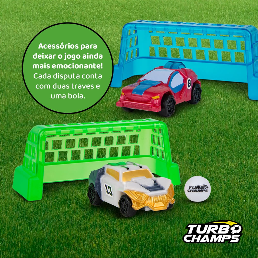 Com o Turbo Champs Desafio 1x1, a rivalidade ganha forma com partidas emocionantes entre dois carrinhos prontos para marcar gols incríveis.