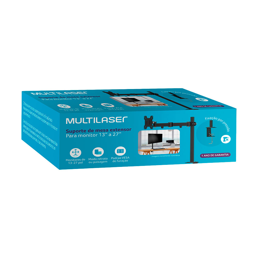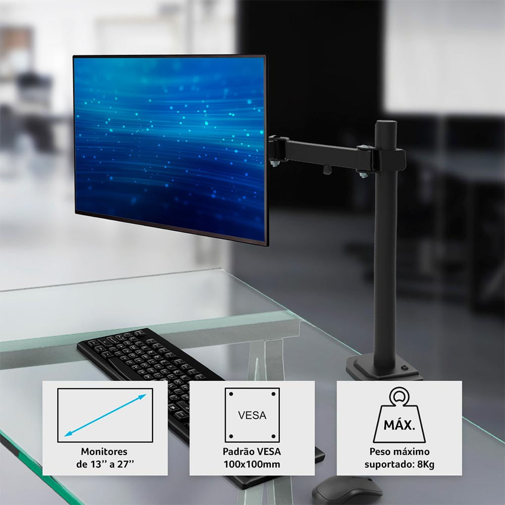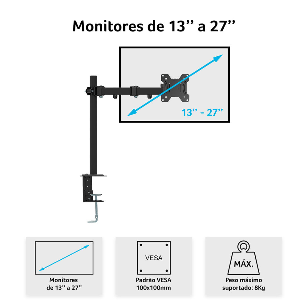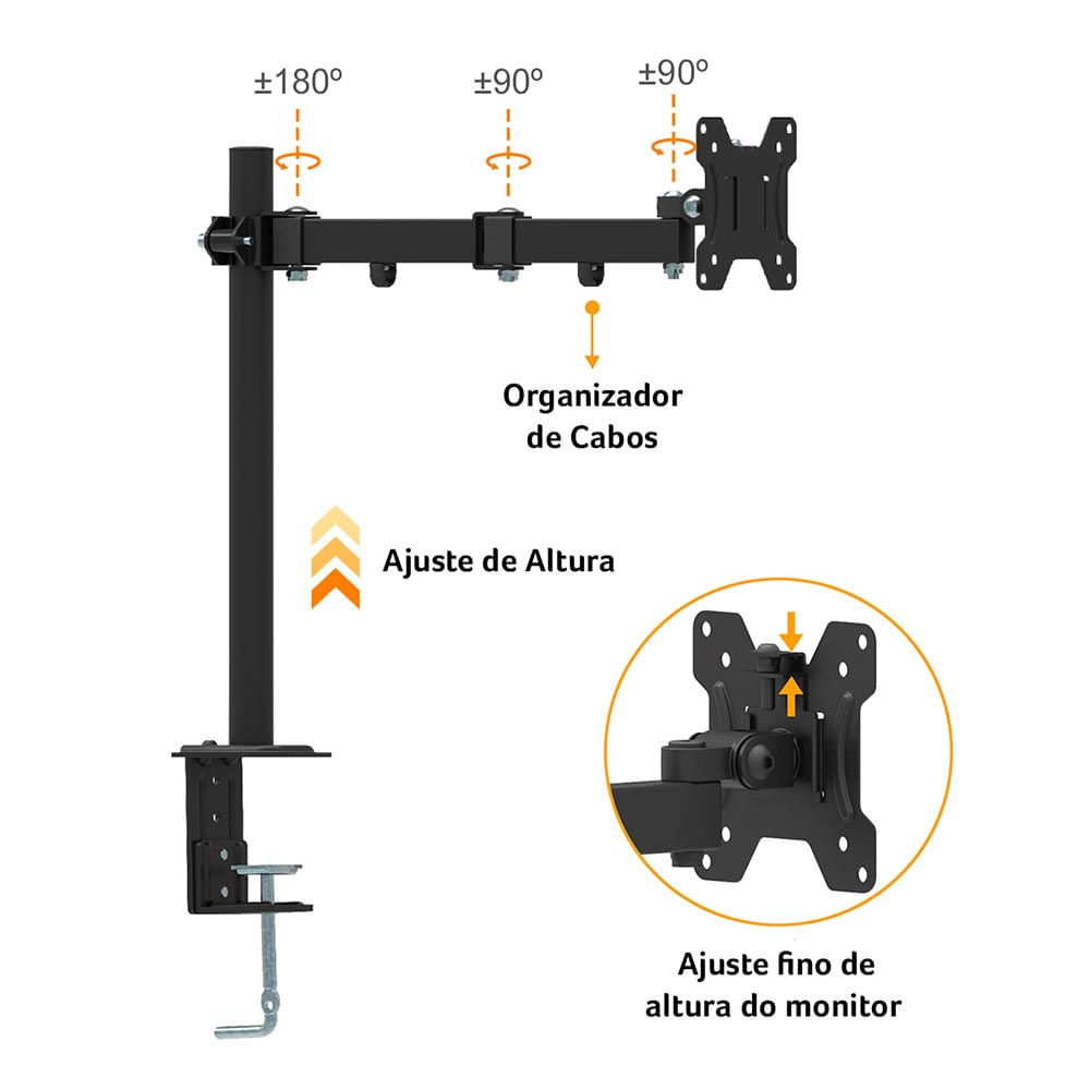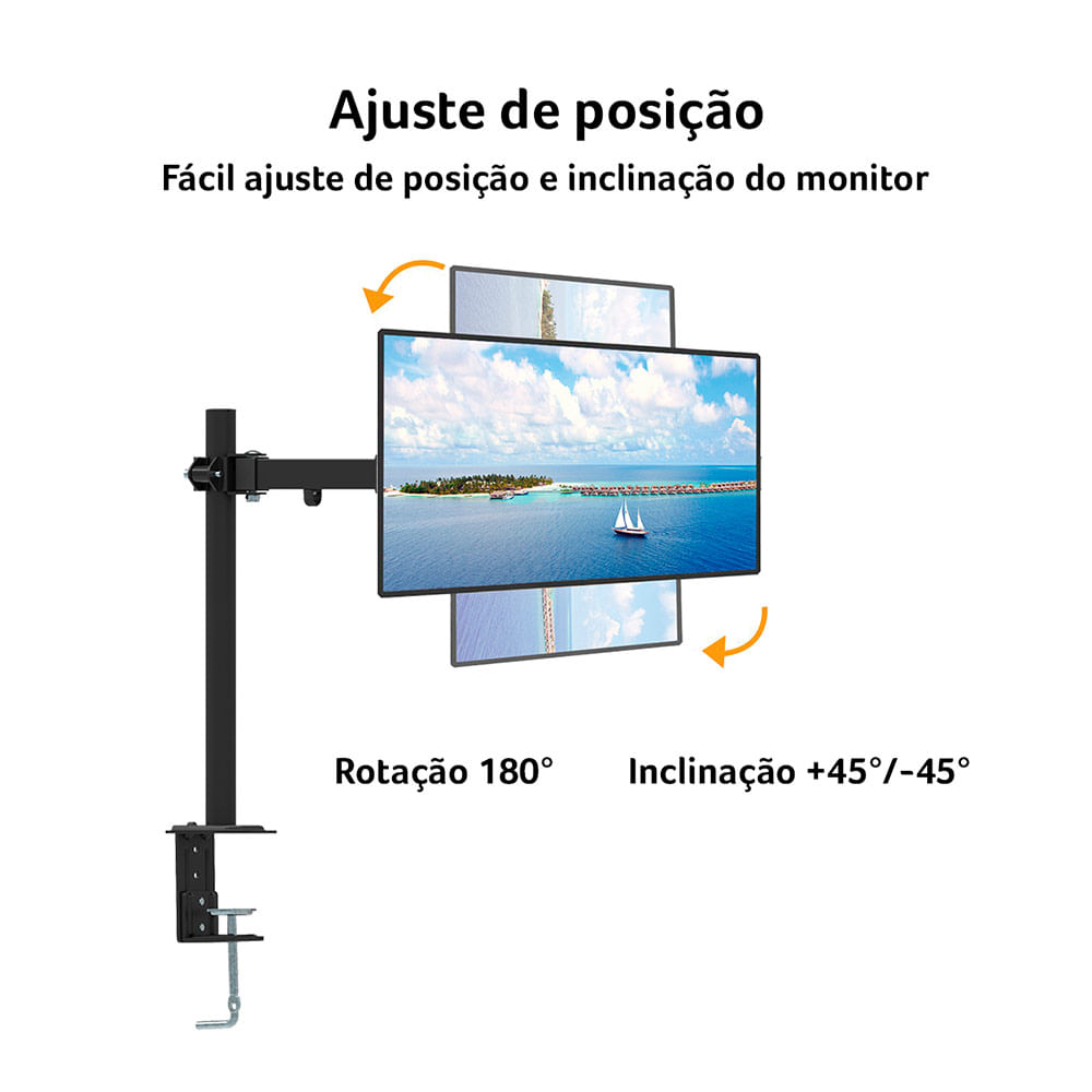Possui altura, inclinação e rotação ajustáveis! Você pode posicionar seu monitor no modo retrato e paisagem. É fácil de instalar! A fixação pode ser por parafuso ou tipo morsa. Suporta monitores de 13 a 27 polegadas, de até 08Kg cada.