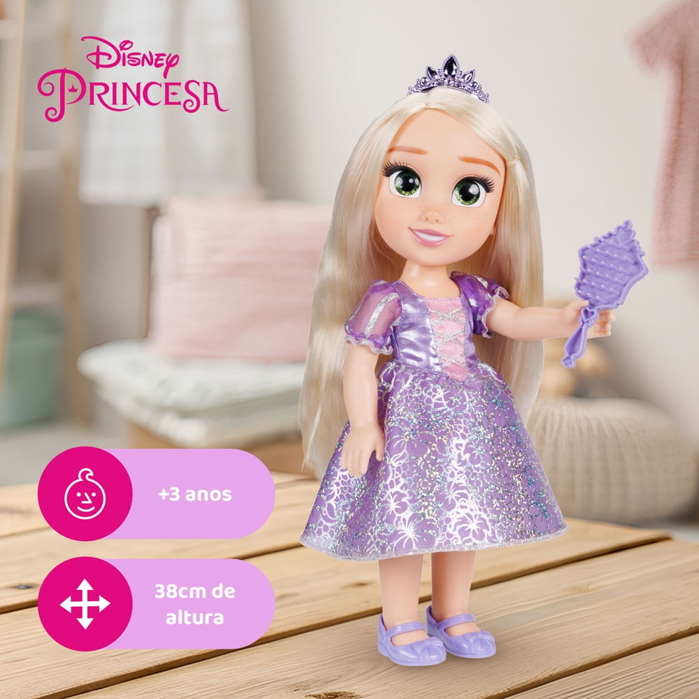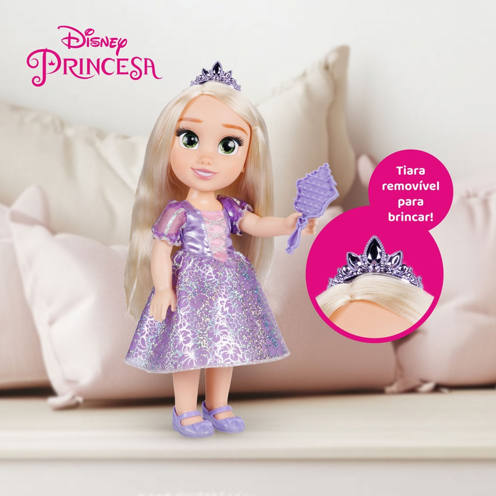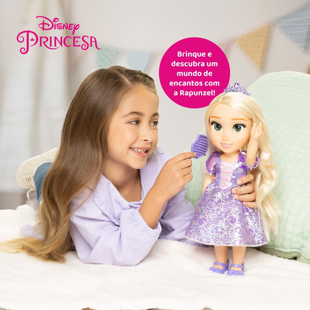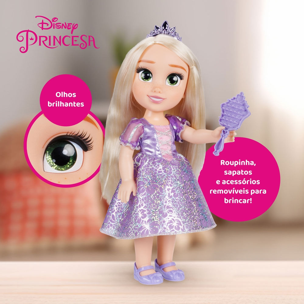 Compartilhe aventuras mágicas e cotidianas com uma amiga querida, com a linda Boneca Disney Princess Rapunzel! Vestida em seu icônico vestido rosa, cabelo super comprido e com belos detalhes de glitter, Rapunzel é super encantadora e está pronta para se juntar a você em qualquer brincadeira! Essa linda boneca possui olhos brilhantes de glitter, mede 38cm de altura e acompanha uma tiara e um lindo par de sapatos. Leve Rapunzel para onde você for e descubra lugares mágicos juntas!
