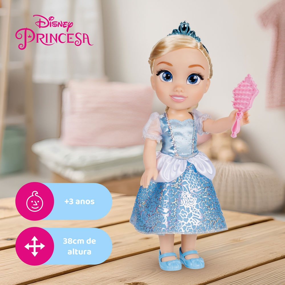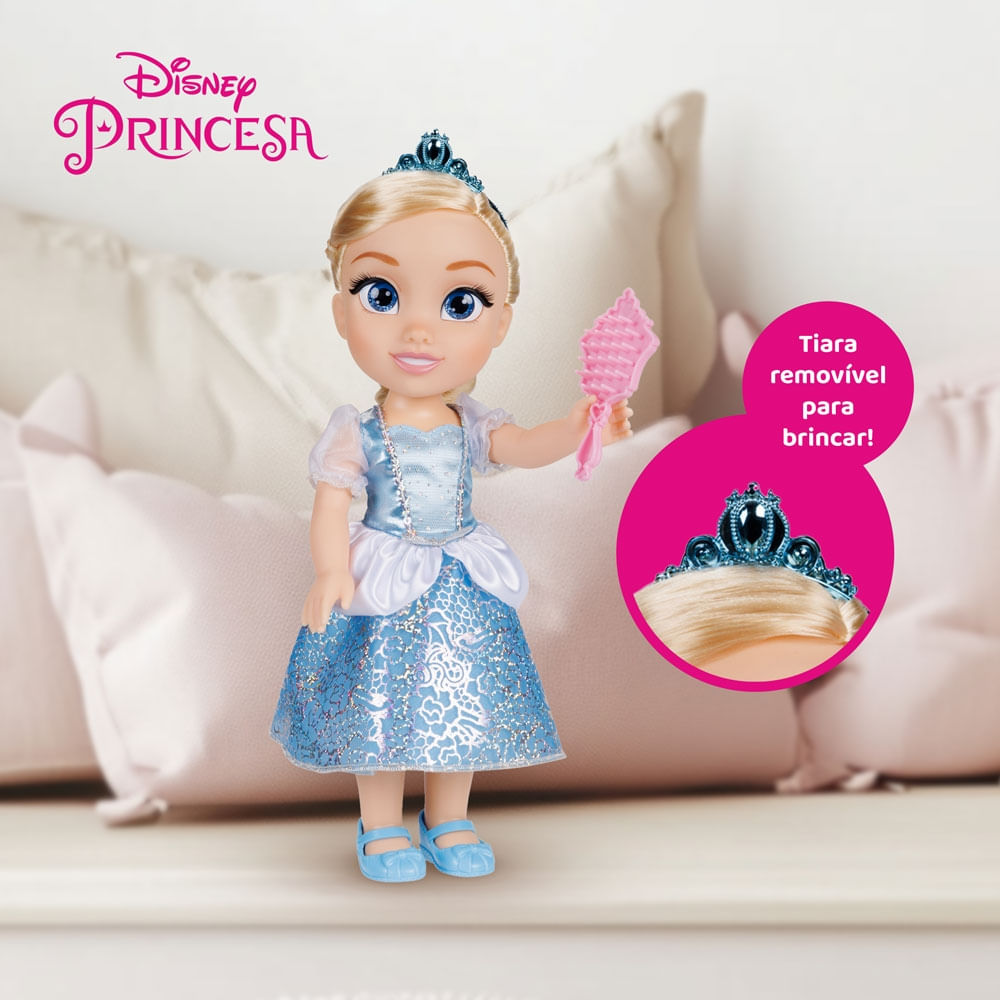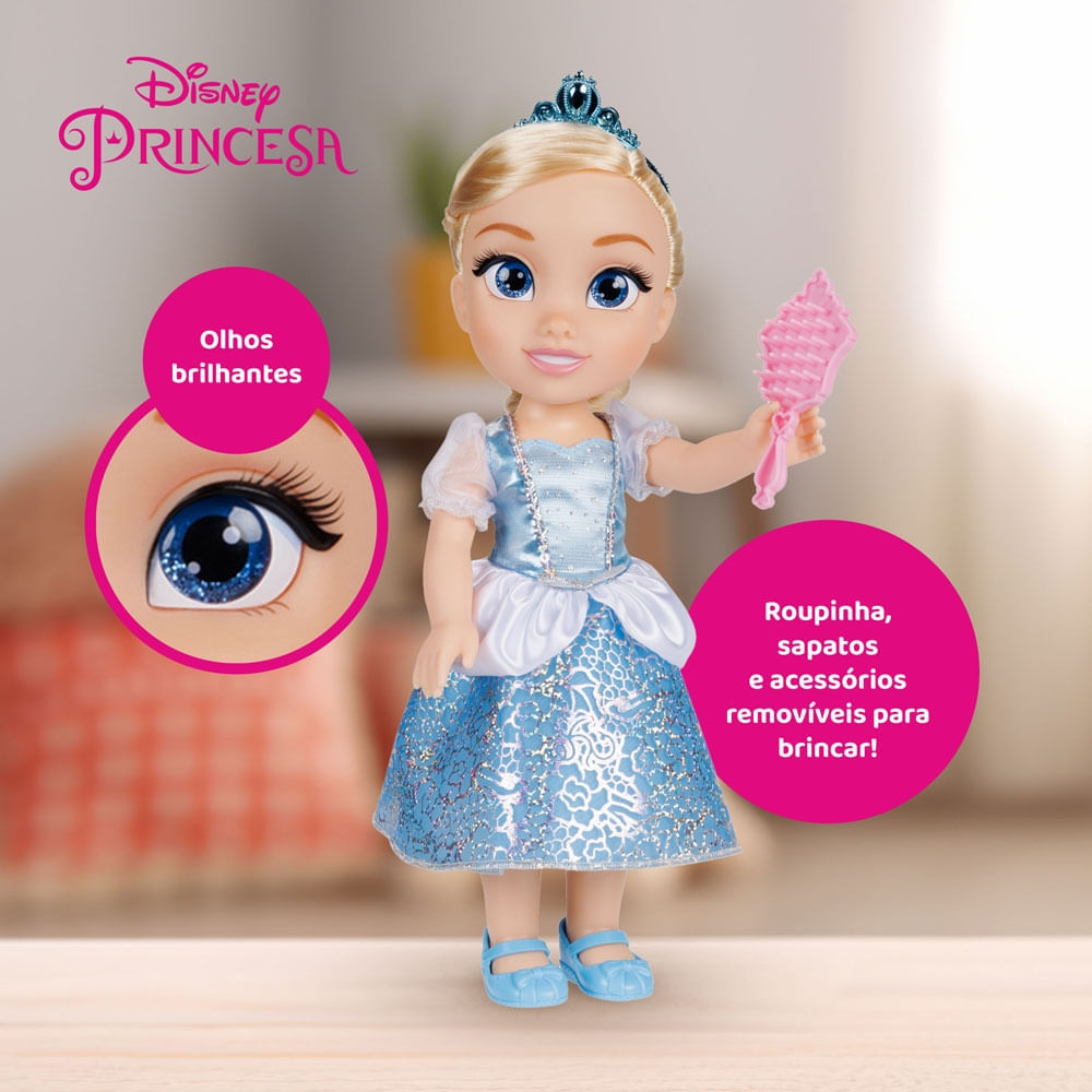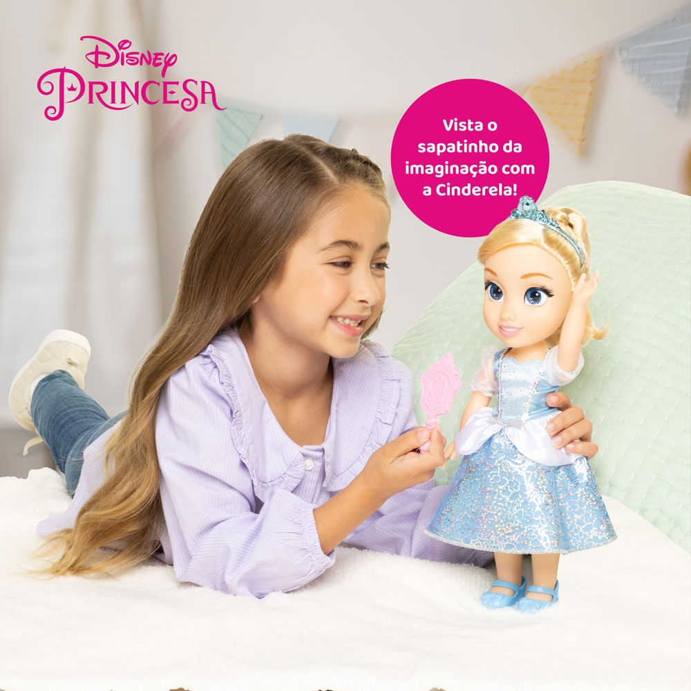 Compartilhe aventuras eternas e cotidianas com uma amiga querida, com a linda Boneca Disney Princess Cinderela! Vestida em seu icônico vestido de baile e com belos detalhes de glitter, Cinderela está pronta para o baile e se juntar a você em qualquer brincadeira! Essa linda boneca possui olhos brilhantes de glitter, mede 38cm de altura e acompanha uma tiara e um lindo par de sapatos. Leve Cinderela para onde você for e crie memórias mágicas juntas!