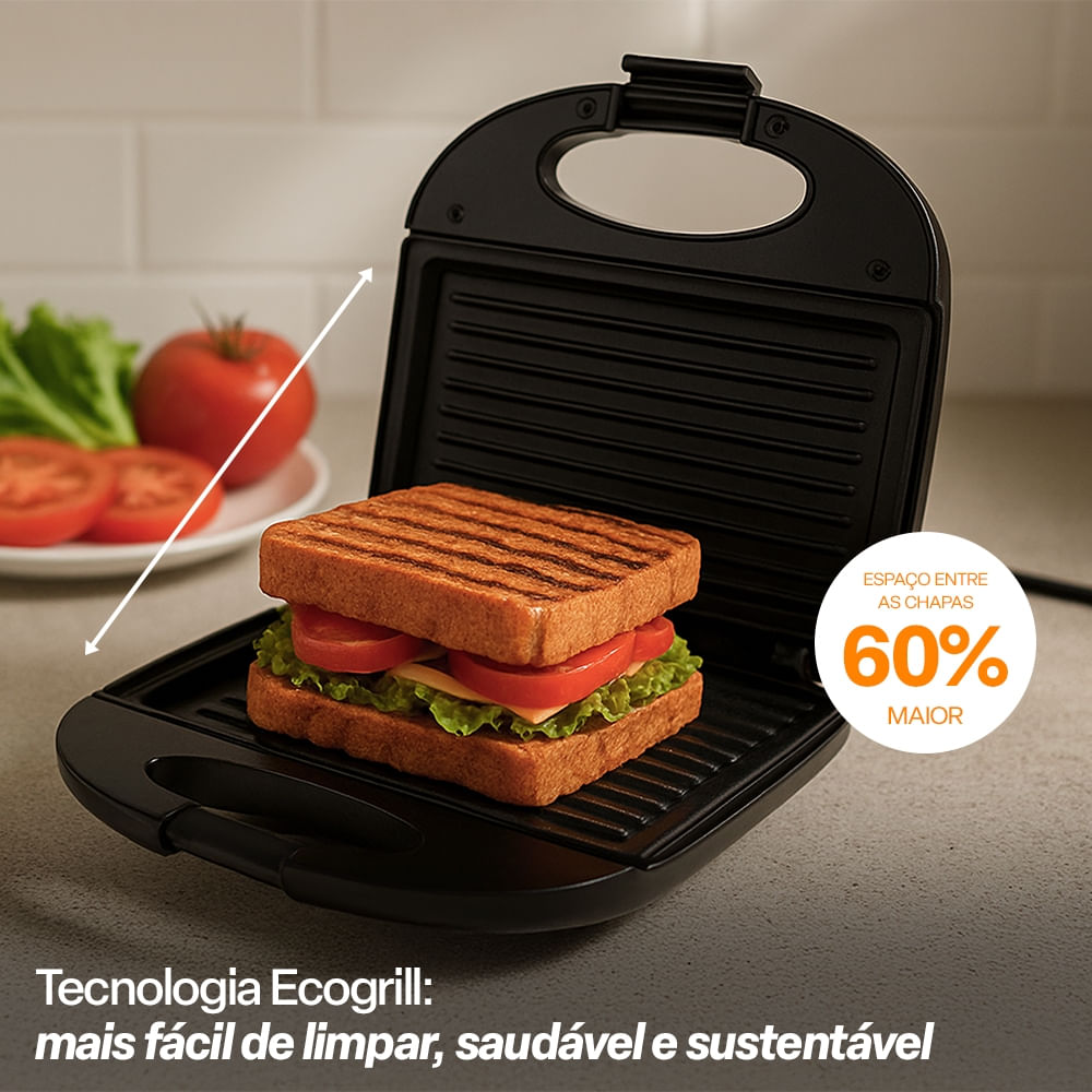 Mais facilidade de limpeza e sustentabilidade: o acabamento do revestimento com tecnologia Ecogrill é mais fácil de limpar e por ser menos propenso a acumular resíduos gordurosos, além de ser mais saudável do que outra sanduicheiras com acabamento à base de óleo e solventes.