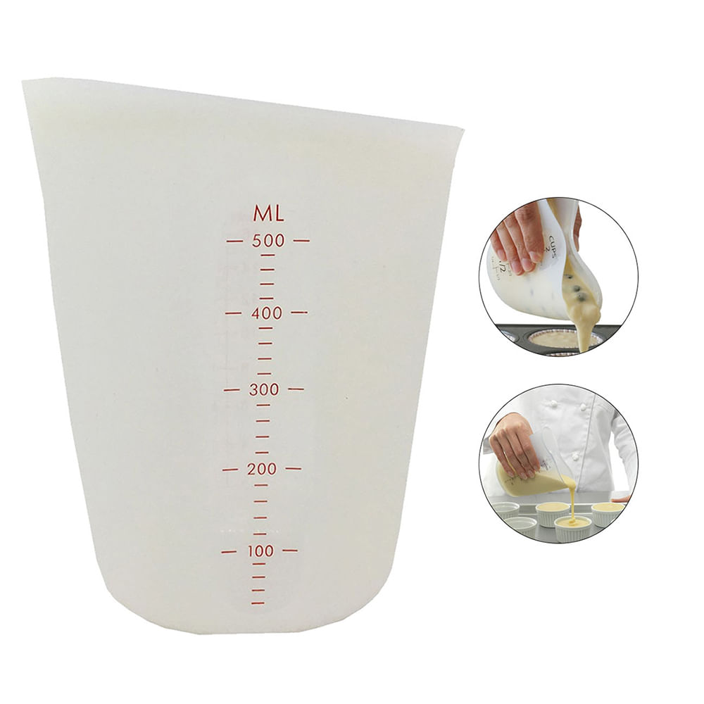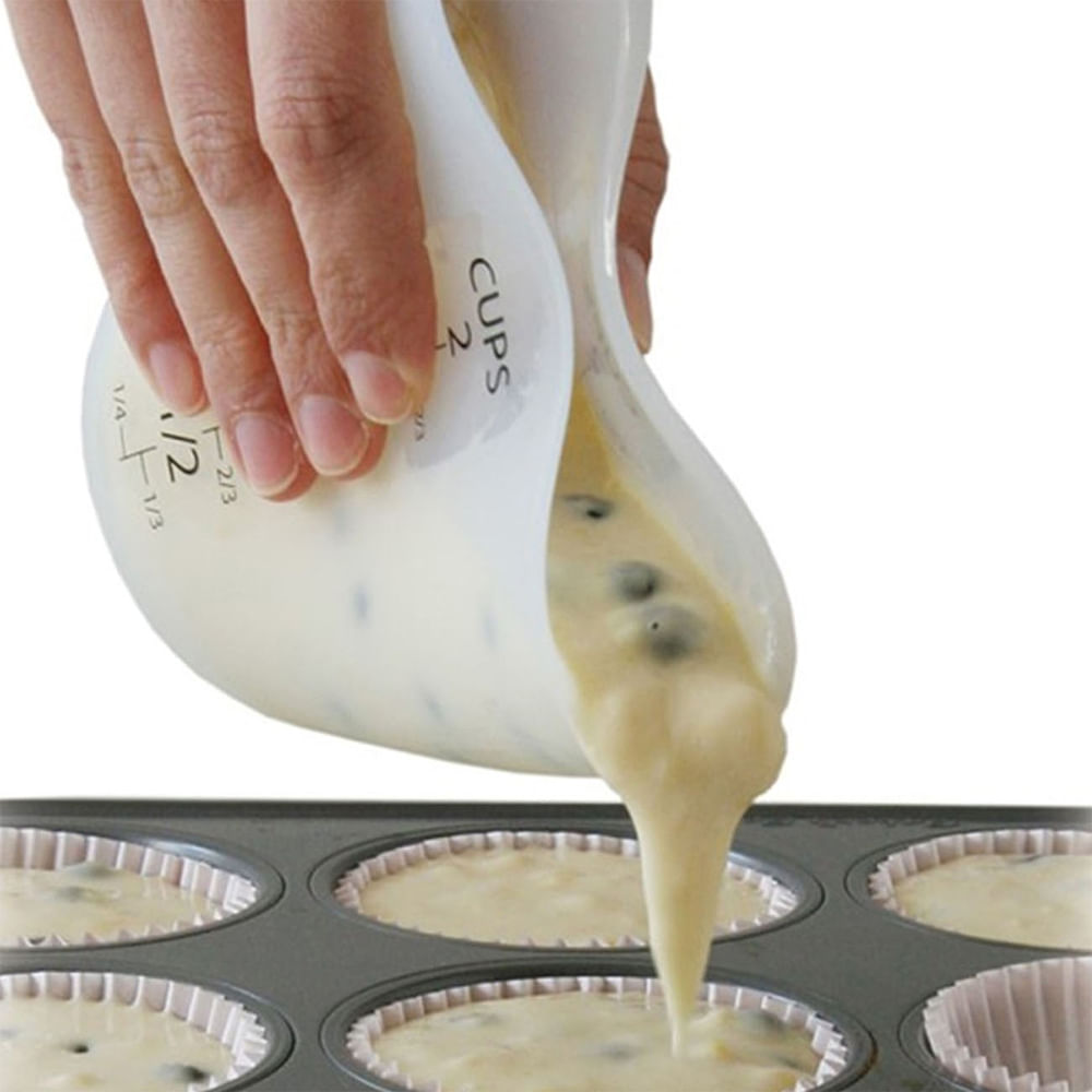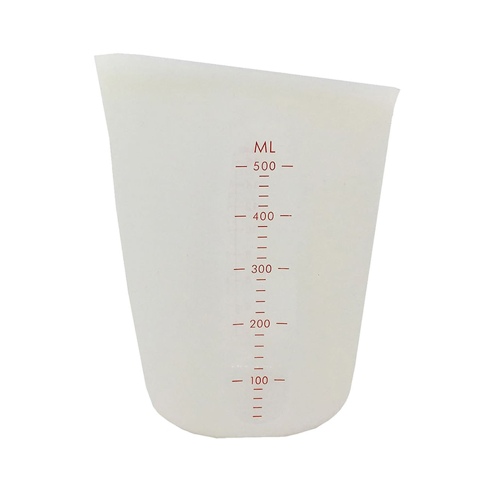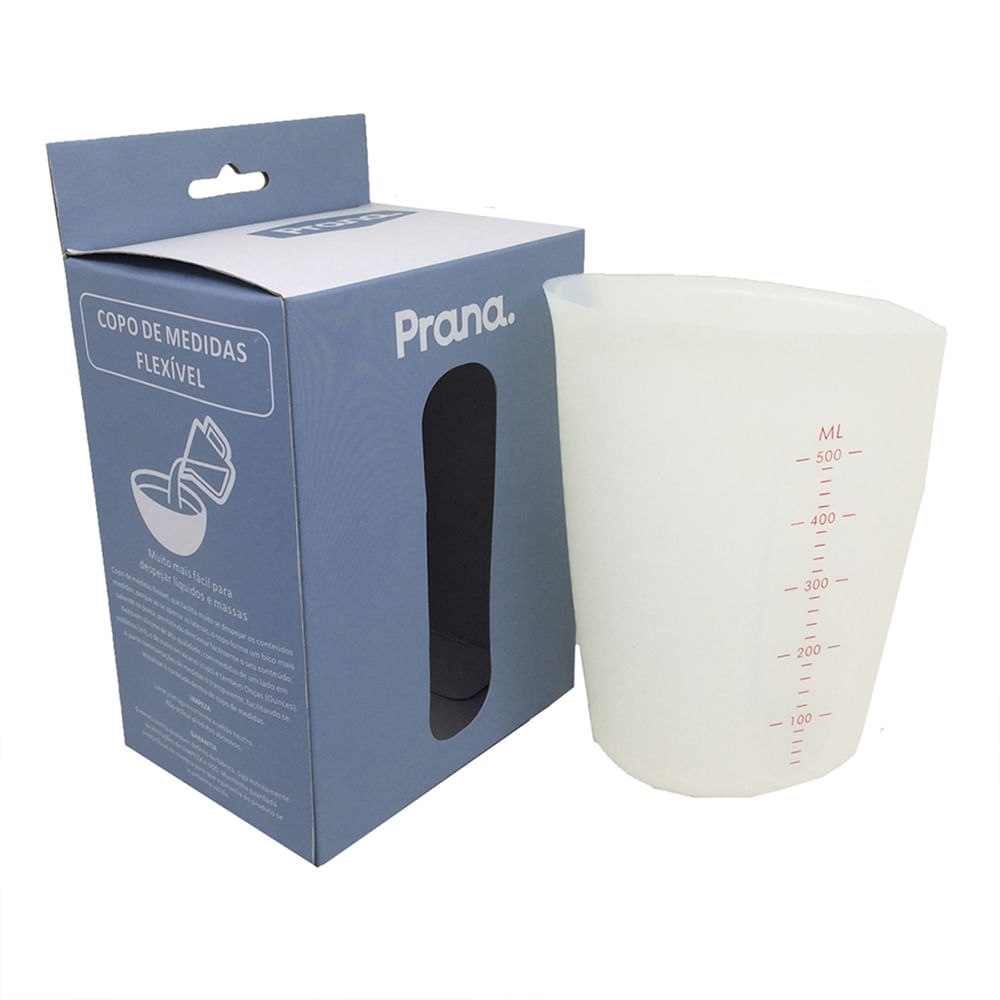 O Copo de medidas flexível da Prana forma um bico saliente ao ser apertado que direciona os líquidos com mais segurança e sem nenhuma sujeira.