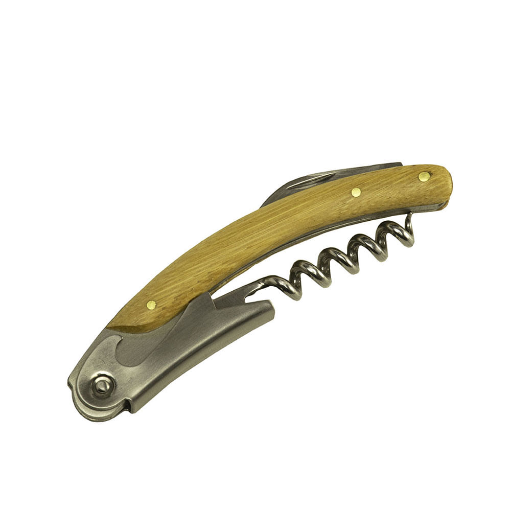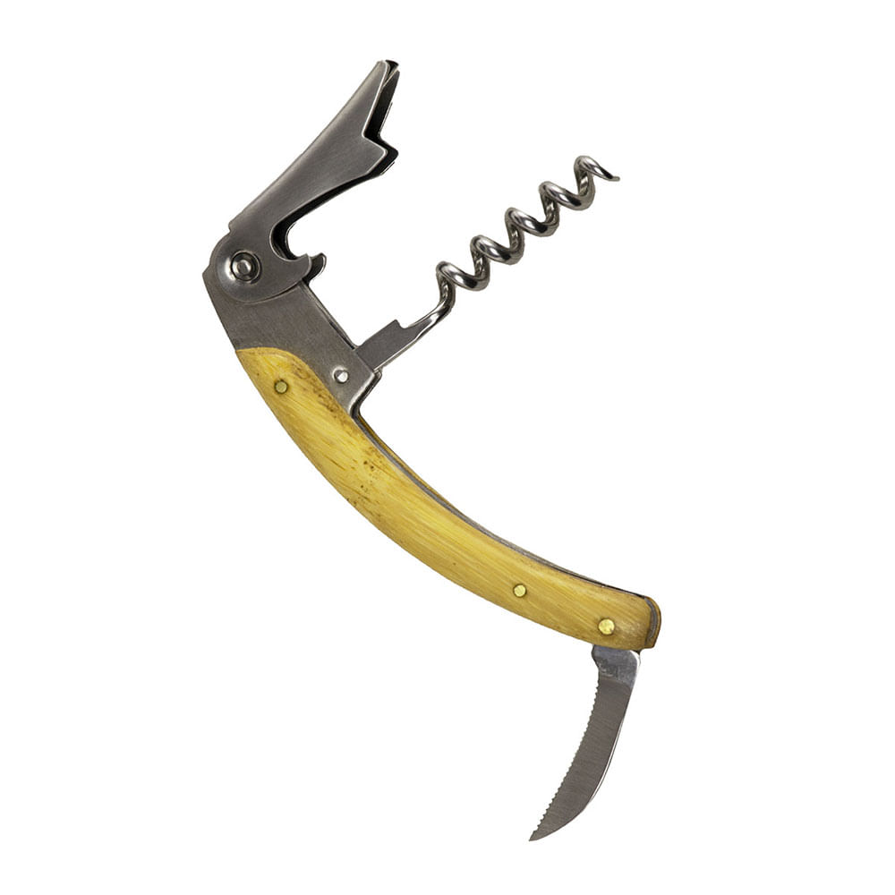 Saca rolhas dois estágios em inox e cabo de madeira.
