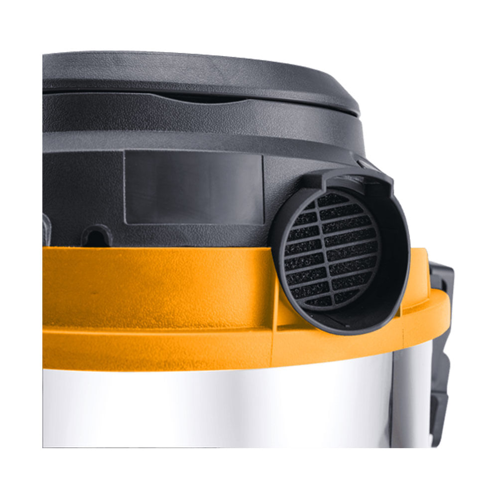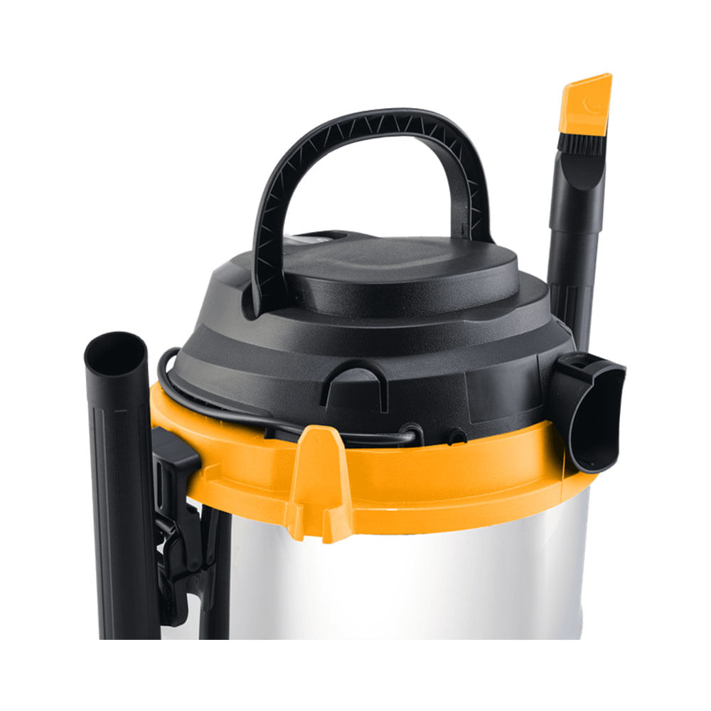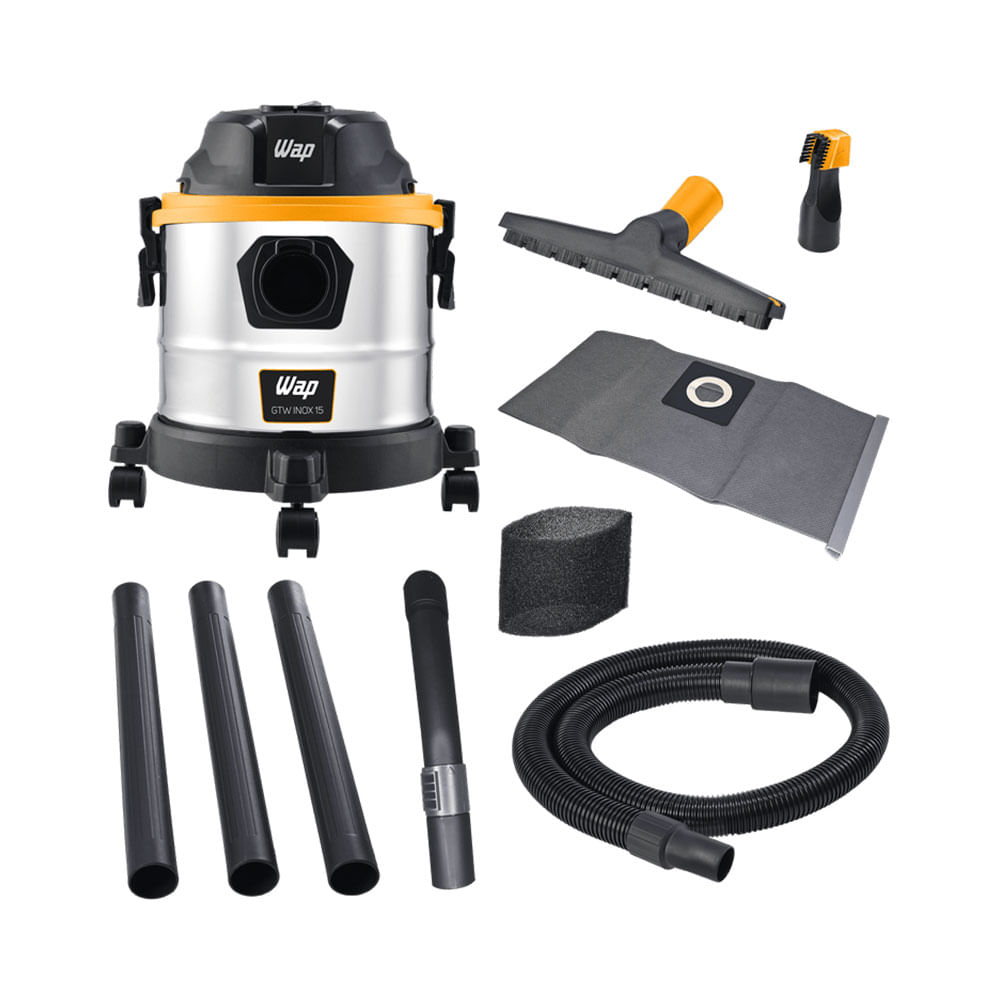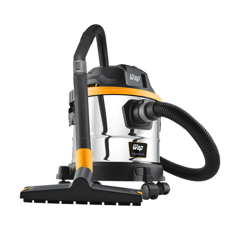Aspirador de Pó e Água 1700W GTW Inox 15 - Wap Um aspirador moderno, prático e potente, o WAP GTW INOX 15 é um aspirador de pó e água com 1700W de potência, que aspira qualquer tipo de sujeira, seca, úmida ou líquida, em qualquer tipo de ambiente. O recipiente em inox aumenta sua resistência e valoriza ainda mais o seu design moderno e funcional. Vem equipado com três extensões retas, mangueira de 1,7 metros, cabo elétrico de 2,5 metros, bico múltiplo, bico canto e escova. Todos esses acessórios garantem maior alcance na área a ser limpa e traz mais conforto para você. Além disso, o WAP GTW INOX 15 possui bocal de sopro que, além de auxiliar na limpeza de lugares inacessíveis, ainda serve para encher infláveis, acender churrasqueiras ou soprar folhas. Além de possuir porta acessórios que deixará a sua forma de trabalhar muito mais rápida e organizada. Com sua alça e rodas para transporte, o aspirador WAP GTW INOX 15 aumenta a sua mobilidade na hora da faxina, além de alcançar os locais mais difíceis com seus acessórios. Robusto e eficiente, é um equipamento que pode ser usado com intensidade para dar conta da limpeza diária. - Frequência: 60 Hz - Vácuo: 146 mbar - Aspira água - Capacidade do recipiente (total/útil): 14,8 L / 6,5 L Acessórios: 03 Extenções Retas; 01 Bico com Escova; 01 Bico Canto sem Escova Componentes: Filtro Espuma; Filtro de Saco de Pano Lavável; 2,5 m de Cabo Voltagem: 110V ou 220V Cor: Inox, Preto e Amarelo Peso líquido: 3,48 kg Dimensões do produto (C x L x A): 39,5 x 39,5 x 43 cm Fabricante: Wap