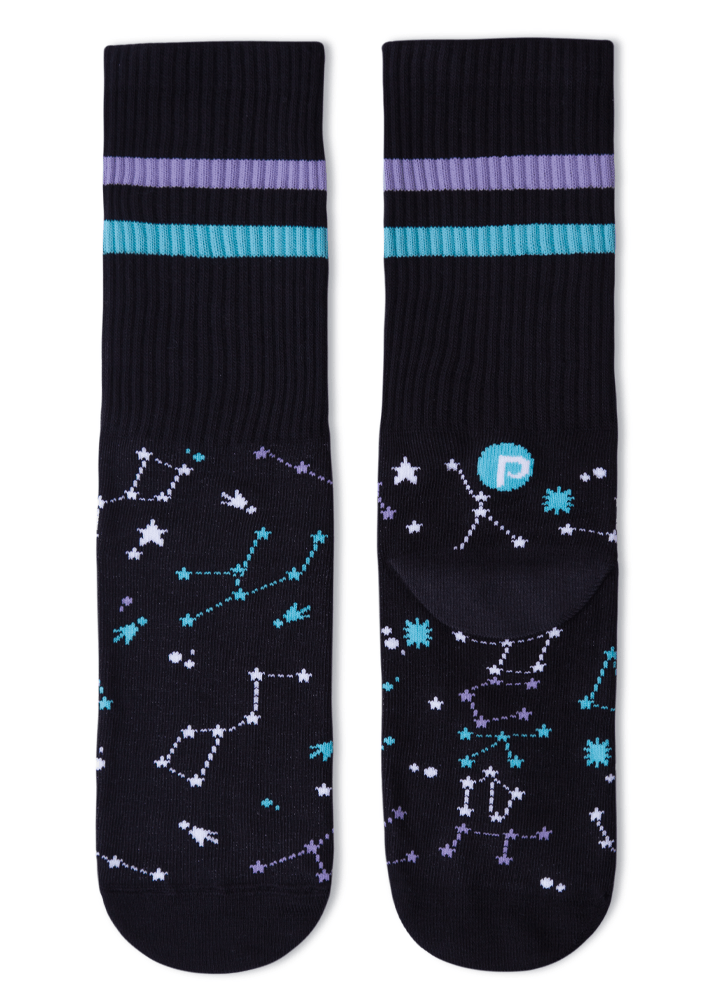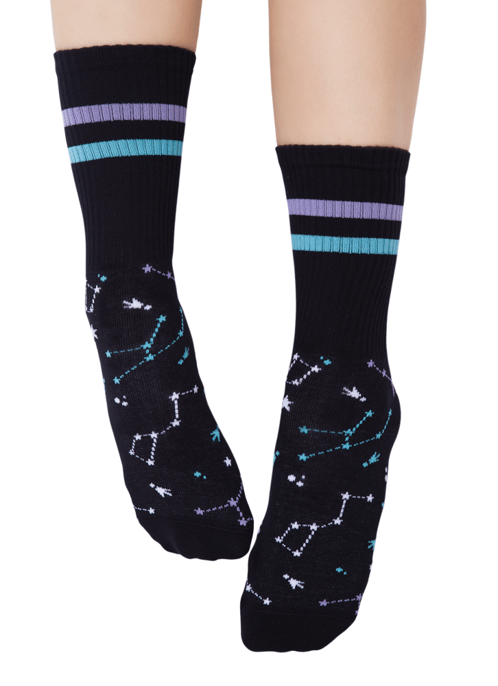 A meia básica possui cano mais longo; mais ou menos na metade da canela, e punho canelado que veste de forma confortável, é produzida com algodão macio em sua maior parte e poliamida. As listras coloridas no punho canelado junto com a padronagem de constelações fazem a meia ficar super divertida e moderna; ideal para ser usada com tênis e sapatos. Instruções lavagem: Lavar a mão Não usar alvejante/ clareador Não secar em tambor Não passar Não limpar a seco