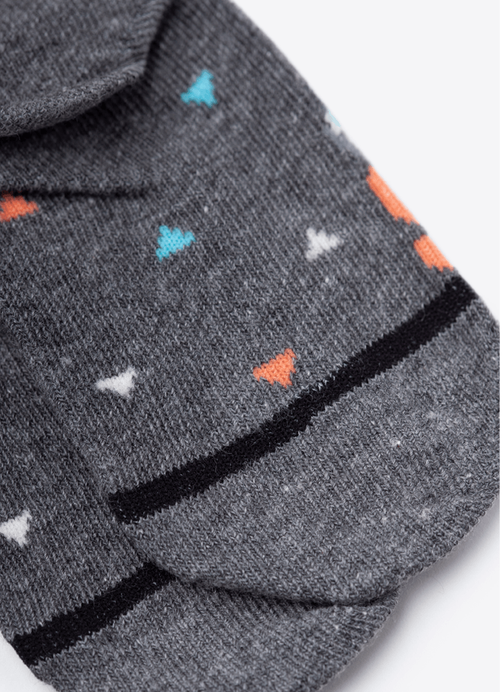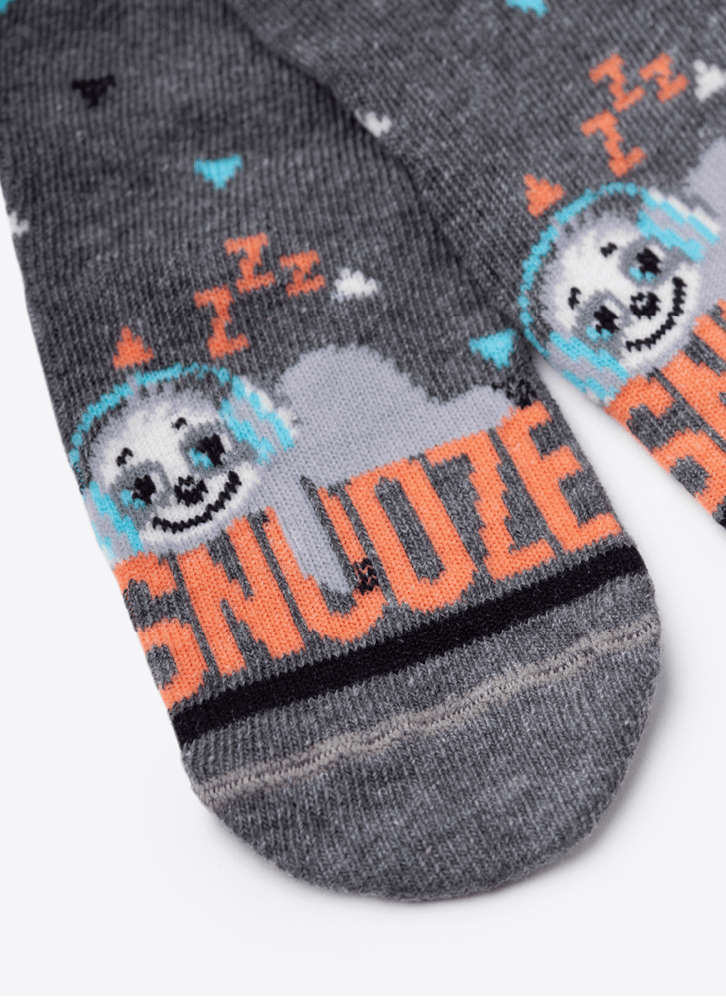 A meia básica cano alto com desenho divertido de preguiça , possui cano mais alto, mais ou menos na metade da canela,punho canelado que veste de forma confortável, é produzida com algodão macio em sua maior parte e poliamida.