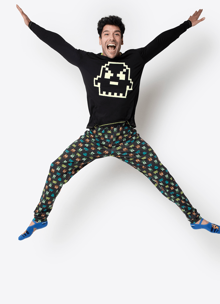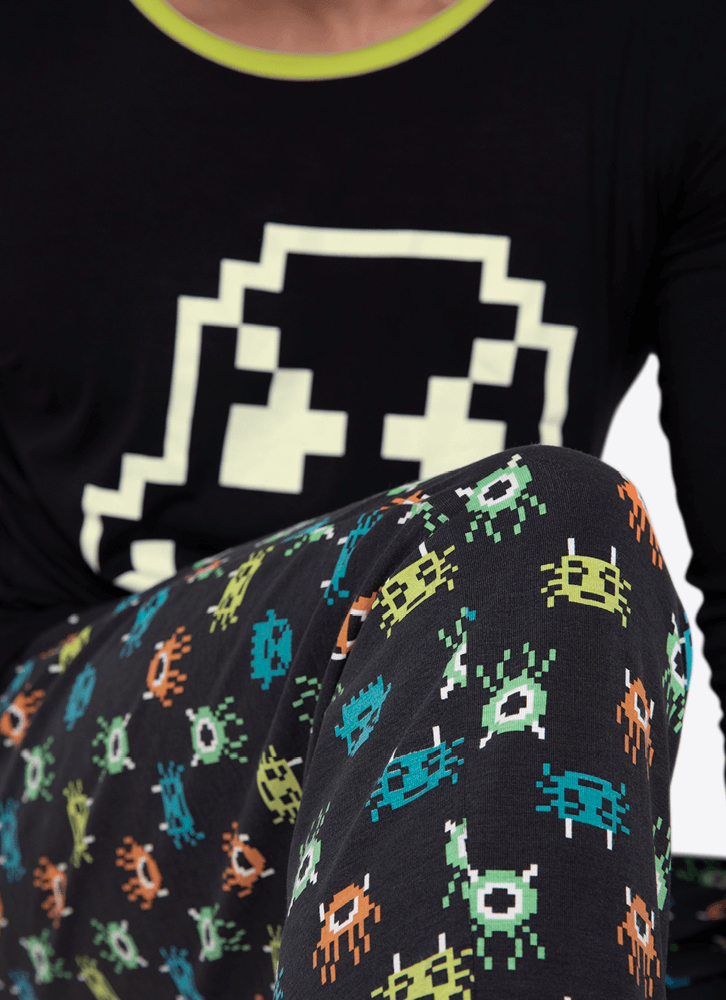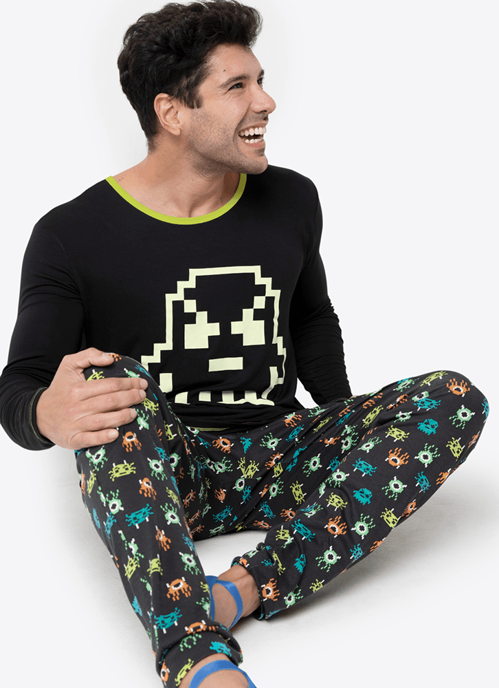 Modelagem: Blusa do pijama de manga longa e com calça com punho na barra. Estampa: Estampa de silk com efeito brilha no escuro e calça estampa rotativa. Tecido: viscolycra. Detalhes: Friso em contraste. Ocasião de uso: para dormir com diversão e conforto. Diferencial: Proporciona conforto durante a vestibilidade, ótimo caimento e toque aveludado. Lavagem e conservação: Lavagem à mão, não alvejar; não secar em tambor; não passar; não limpar a seco (mais informações, vide na etiqueta). Garantia: deverá ser encaminhado dentro da embalagem original; sem indicações de uso; acompanhado de nota fiscal e com todos os Itens constante na solicitação da compra.
