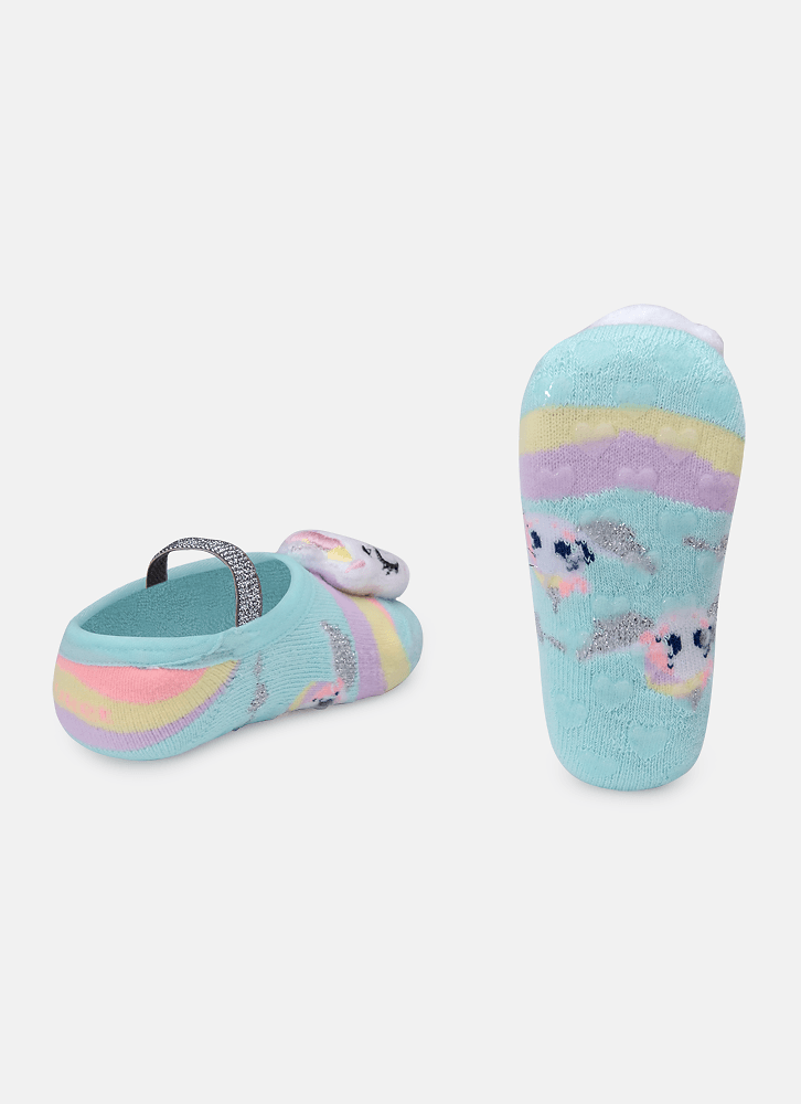 Meia com modelagem sapatilha atoalhada com desenho divertido do unicórnio. Possui aplique de unicórnio com Led, que é ativado a cada pisada. Produzida com algodão macio em sua maior parte poliamida, e detalhes com fio de lurex. Possui acabamento em viés e elástico confortável com detalhes em lurex. Solado com antiderrapante com aroma de morango. Indicação de uso: Ideal para praticar exercícios e brincadeiras sem o calçado e uso no dia a dia em casa. Instruções de Lavagem: Lavagem a mão Não alvejar Instruções de Conservação: Não secar em tambor Não passar Não limpar a seco (MAIS INFORMAÇÕES, VIDE NA ETIQUETA) Instruções de Garantia: Deverá ser encaminhado dentro na embalagem original ACOMPANHADO DE NOTA FISCAL E com todos os itens constante na solicitação da compra.