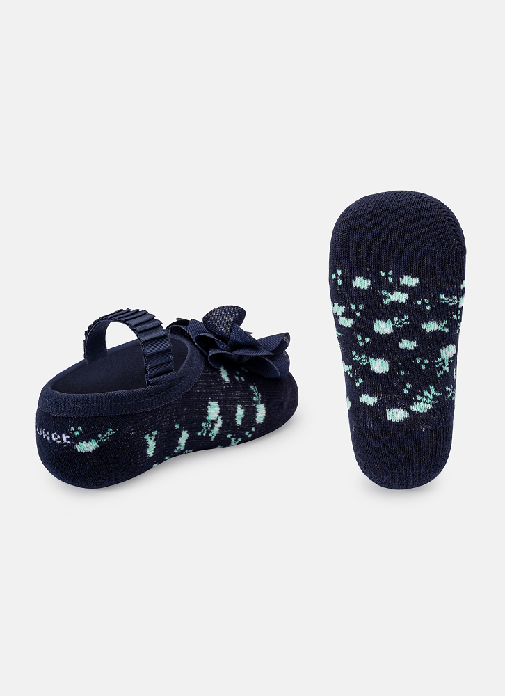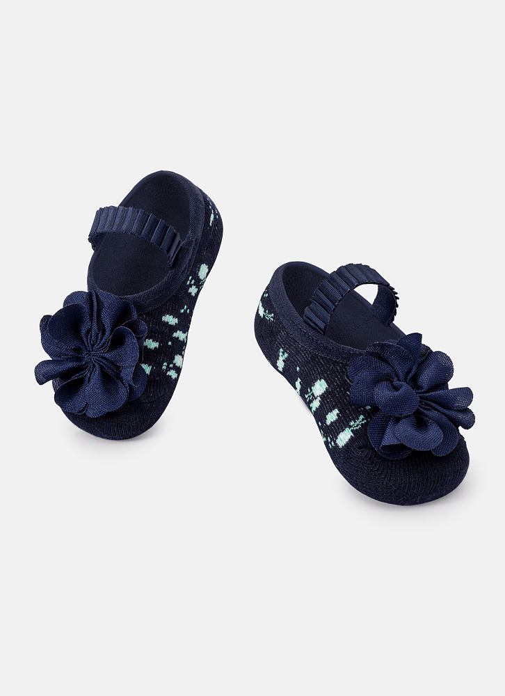A meia com modelagem sapatilha com desenho de flores , é produzida em algodão macio, possui acabamento em viés, e elástico confortável e texturizado. Possui aplique de frufru aplicado na frente da meia e antiderrapante no tamanho 9 á 12 meses, de borbol