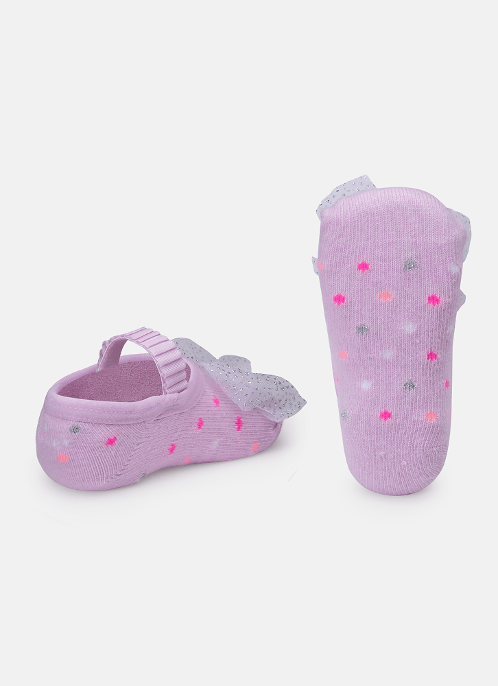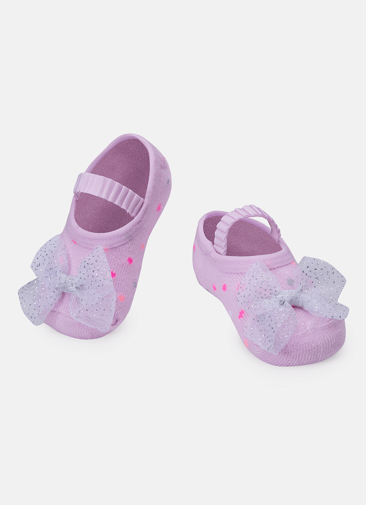 A meia com modelagem sapatilha com desenho de balões, é produzida em algodão macio, possui acabamento em viés, e elástico confortável. Possui aplique de laço aplicado na frente da meia e antiderrapante no tamanho 9 á 12 meses, com aroma cheirinho de be