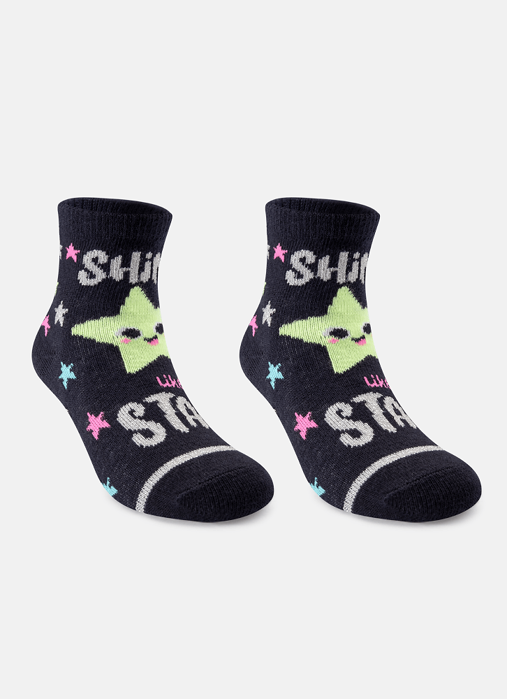 "A meia soquete possui cano de altura média, é produzida com algodão macio em sua maior parte e poliamida. Além da padronagem de estrelas e um desenho da estrela com o fio que brilha no escuro; que fazem a meia ficar super moderna. Instruções lavagem: Lavar a mão Não usar alvejante/ clareador Não secar em tambor Não passar Não limpar a seco"