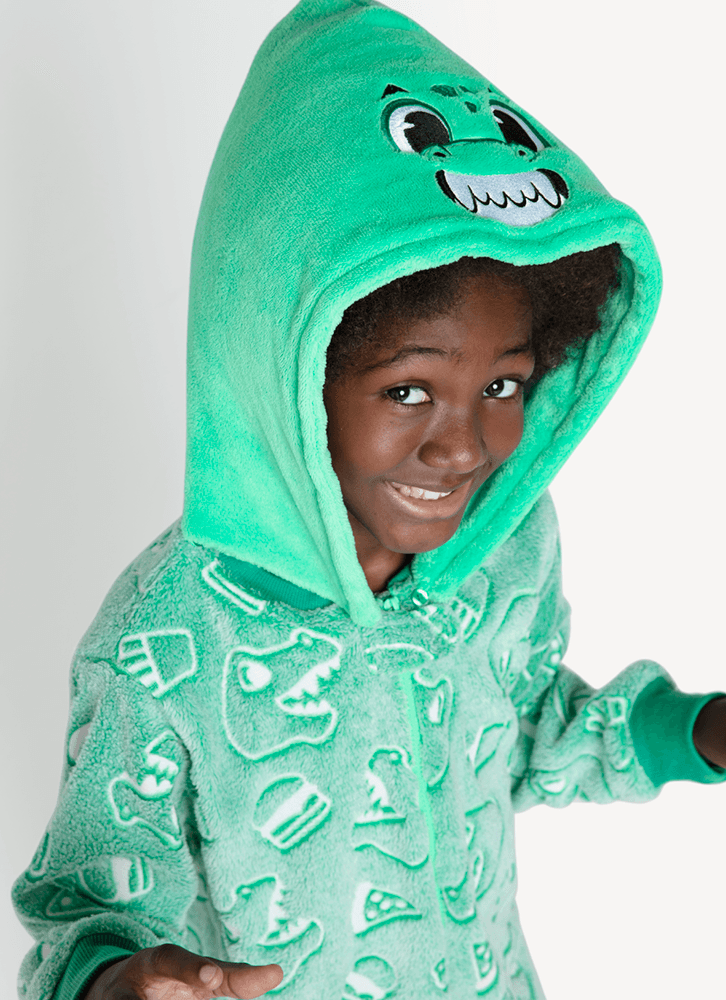 Descrição: Macacão fantasia Dino food. Para noites tranquilas de sono, momentos de relaxamento em casa, festa do pijama, home office e onde mais sua imaginação te levar. Detalhes: •Macacão com mangas e calças compridas. •Fechamento frontal através de zíper. •Mangas e calça com acabamento em punho. •Estampa repetida de Dino food com efeito brilha no escuro. •Capuz removível com desenho 3D de Dino food. •Tecido: soft. Cuidados: Lavagem e conservação: Lavagem à mão, não alvejar; não secar em tambor; não Passar; não limpar a seco (mais informações, vide na etiqueta). Garantia: deverá ser encaminhado dentro da embalagem original; sem indicações de uso; acompanhado de nota fiscal e com todos os Itens constante na solicitação da compra.