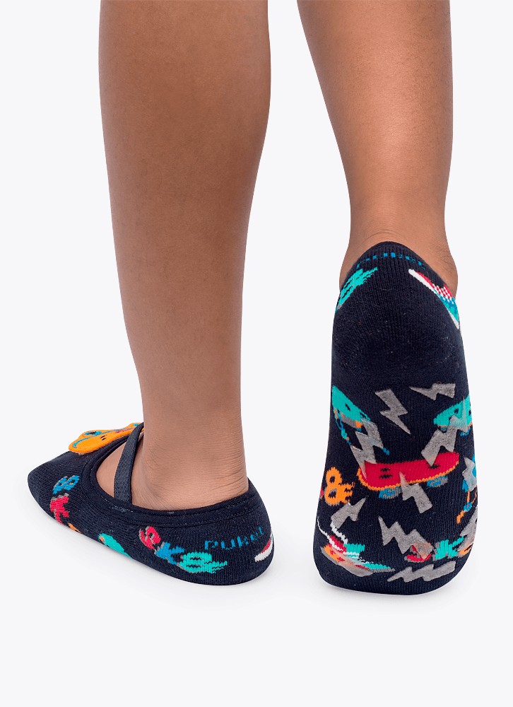 Meia com modelagem de sapatilha desenhada, possui aplique na parte frontal da meia. Possui acabamento em viés e elástico confortável. Produzida com algodão macio, com a área do desenho em poliamida. Cuidados: Lavar a mão, não alvejar; não secar em tambor, não passar e não limpar a seco. Para mais informações, vide a etiqueta. Garantia: Deve ser encaminhado dentro da embalagem original, acompanhado da nota fiscal e com todos os itens constante na solicitação da compra.