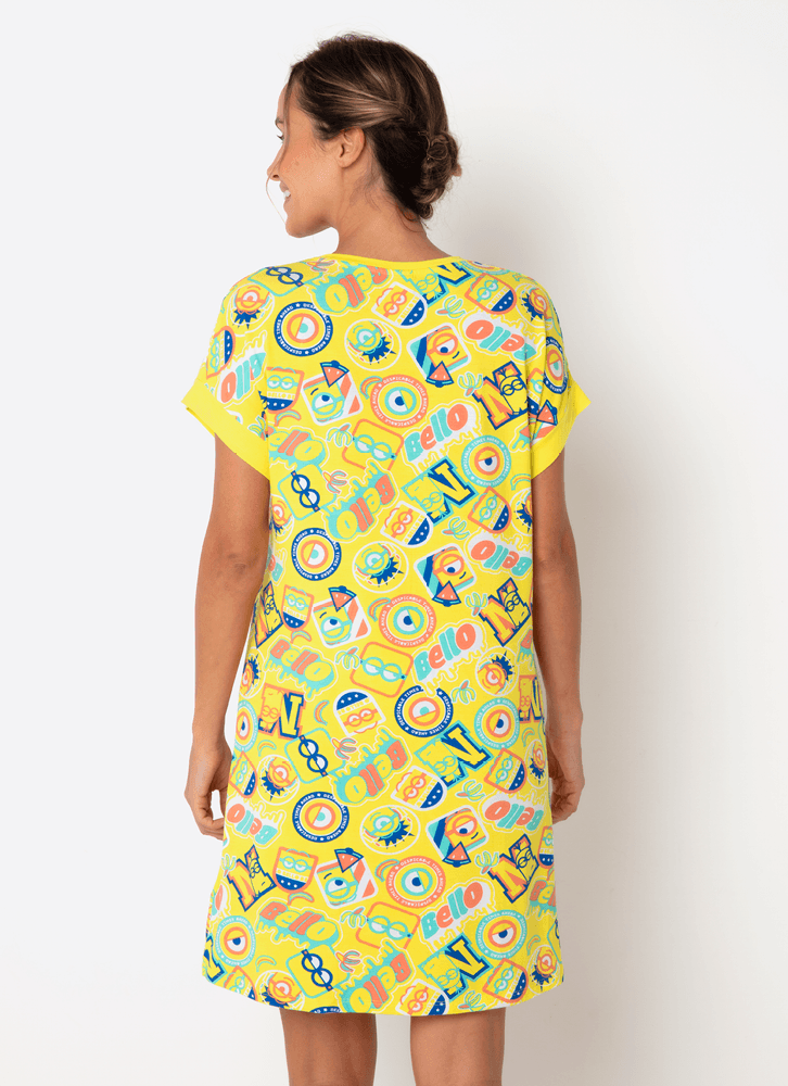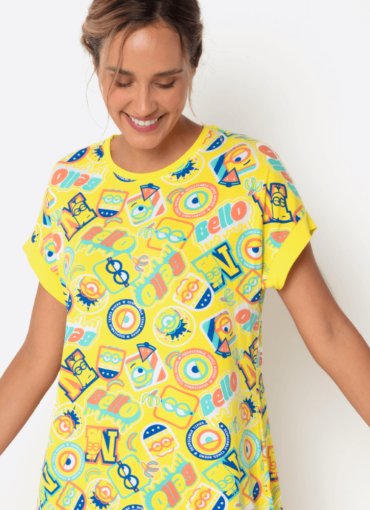 Camisola com estampa exclusiva Minions para Puket Para noites tranquilas de sono e momentos de relaxamento em casa. Detalhes: • Camisola de manga curta. • Estampa corrida • Gola redonda. • A camisola de viscolycra da Puket proporciona conforto durante a vestibilidade, toque macio e ótimo caimento. • Tecido: Camisola lado frente (estampado) de viscolycra. • Mangas, viés e costas: meia malha de poliéster com viscose e elastano. Cuidados: Lavagem e conservação: Lavagem à mão, não alvejar; não secar em tambor; não Passar; não limpar a seco (mais informações, vide na etiqueta). Garantia: deverá ser encaminhado dentro da embalagem original; sem indicações de uso; acompanhado de nota fiscal e com todos os Itens constante na solicitação da compra.