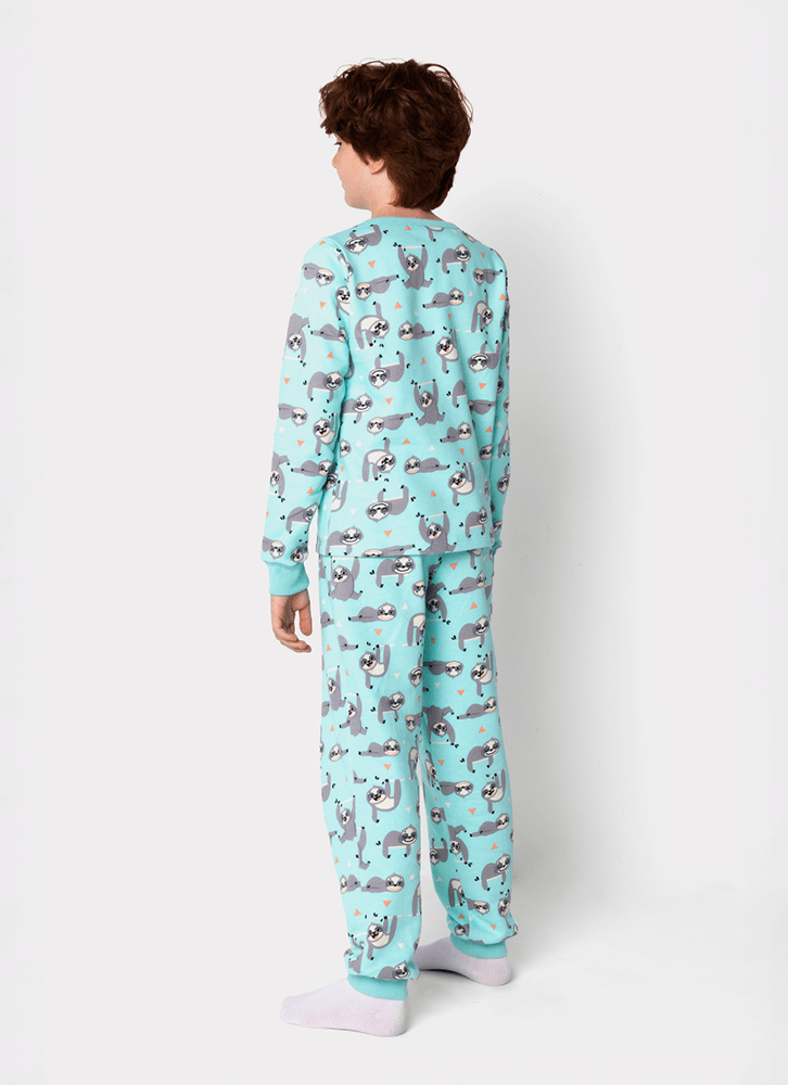 Pijama de Moletom estampado com toque macio para noites tranquilas de sono e momentos de relaxamento em casa. Detalhes: Mangas compridas; Estampa corrida tema Preguiça; Gola redonda; Gola e punho contrastante: Calça com elástico macio embutido na cintura; Calça modelagem reta; O pijama de moletom proporciona conforto, toque macio, além de ótimo caimento; Tecido: Moletom Cuidados: Lavagem e conservação: Lavagem à mão, não alvejar, não secar em tambor. não passar; não limpar à seco (mais informações, vide etiqueta). Garantia: Deverá ser encaminhado dentro da embalagem original, sem indicações de uso, acompanhado de nota fiscal e com todos os itens constantes na solicitação de compra.
