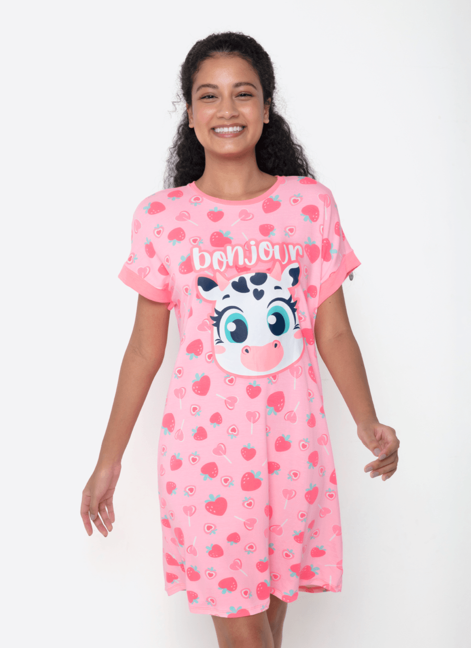 Camisola de viscolycra com estampa exclusiva e divertida Vaca Romântica A camisola da Puket proporciona conforto durante a vestibilidade, toque macio e ótimo caimento. Perfeita para noites tranquilas de sono e momentos de relaxamento em casa. Camisola de manga curta estampada de viscolycra. Estampa frontal. Gola redonda. Mangas e viés: meia malha de poliéster com viscose e elastano. Cuidados: Lavagem à mão, não alvejar; não secar em tambor; não limpar a seco; secagem em varal por gotejamento a sombra; não passar ou utilizar vaporização; (mais informações, vide na etiqueta). Garantia: Deverá ser encaminhado dentro da embalagem original, sem indicações de uso, acompanhado de nota fiscal e com todos os itens constante na solicitação da compra.