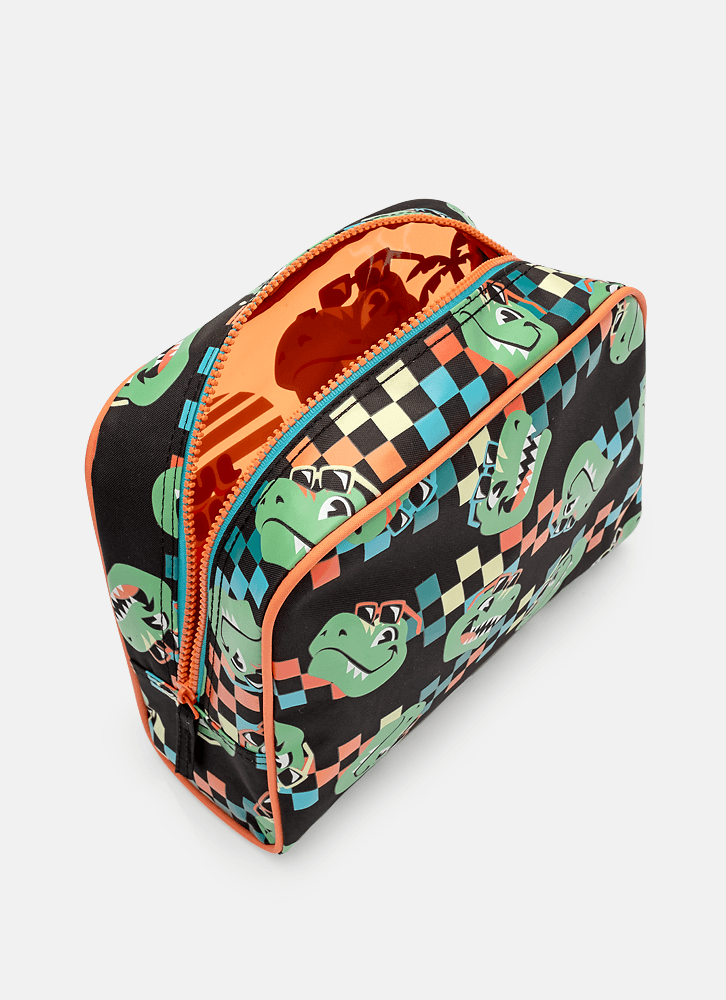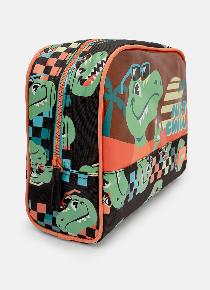 Necessaire grande em nylon com estampa de dino. Recorte frontal em PVC transparente com estampa localizada de dino.