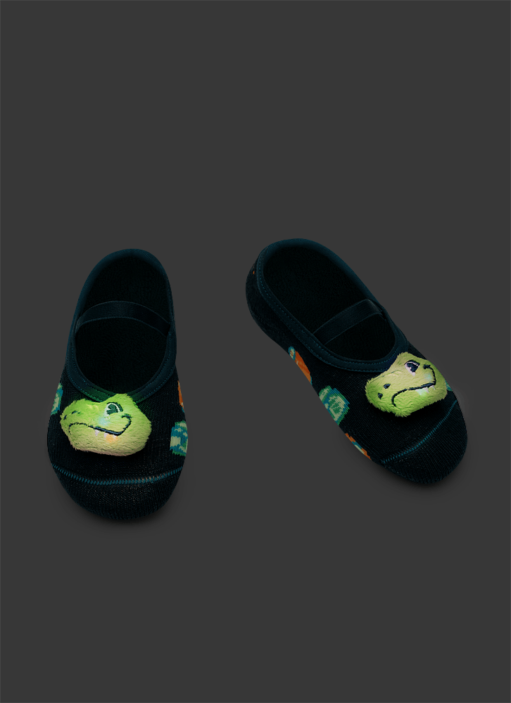 'Meia sapatilha atoalhada, com desenho no tema dino com latinhas, e aplique fixo Led dw dino. Produzida com algodão macio em sua maior e parte poliamida no desenho. Possui acabamento em viés e elástico confortável. Solado com antiderrapante com aroma de menta. Indicação de uso: Ideal para praticar exercícios e brincadeiras sem o calçado e uso no dia a dia. Instruções de Lavagem: Lavagem a mão Não alvejar Instruções de Conservação: Não secar em tambor Não passar Não limpar a seco (MAIS INFORMAÇÕES, VIDE NA ETIQUETA) Instruções de Garantia: Deverá ser encaminhado dentro na embalagem original, sem indicações de uso ACOMPANHADO DE NOTA FISCAL E com todos os itens constante na solicitação da compra.'