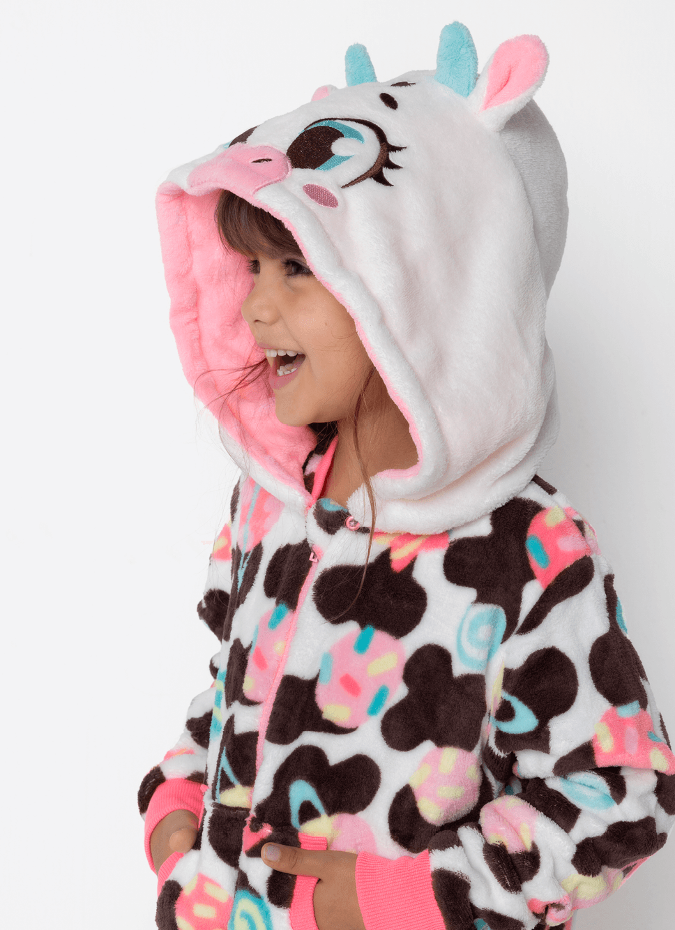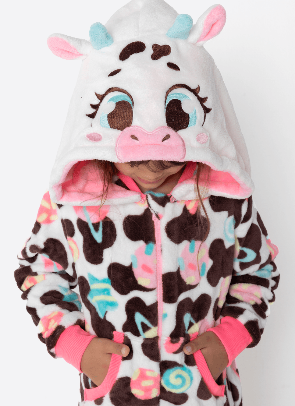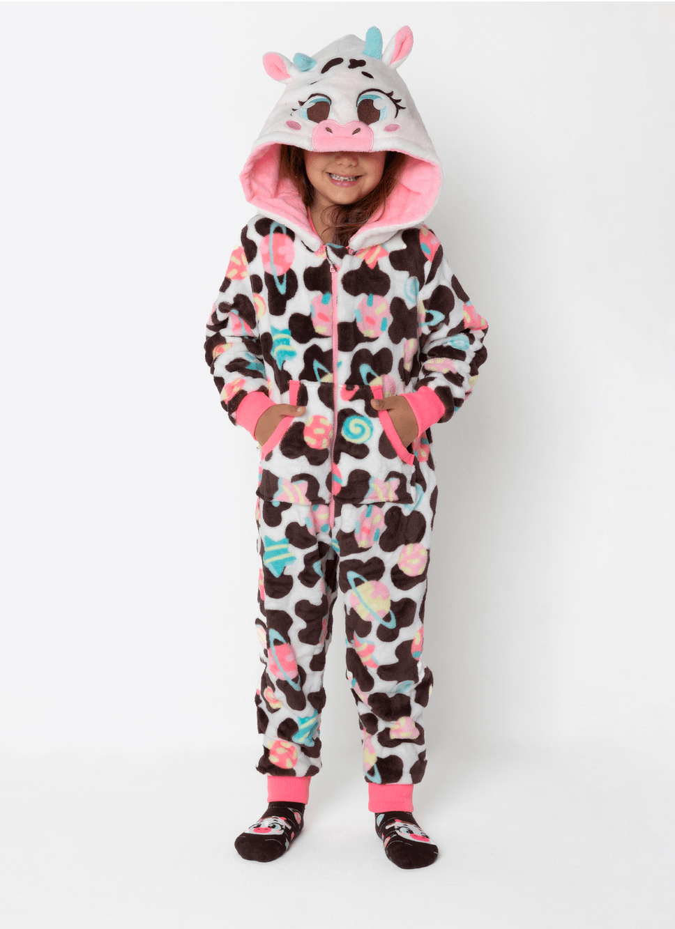 Macacão em coral fleece com estampa de vaquinha Puket <3