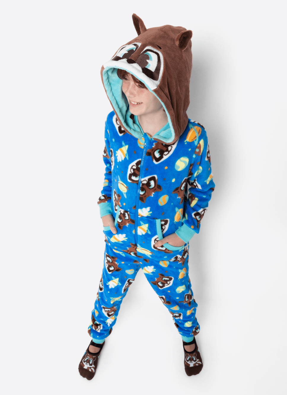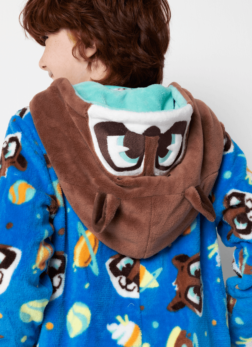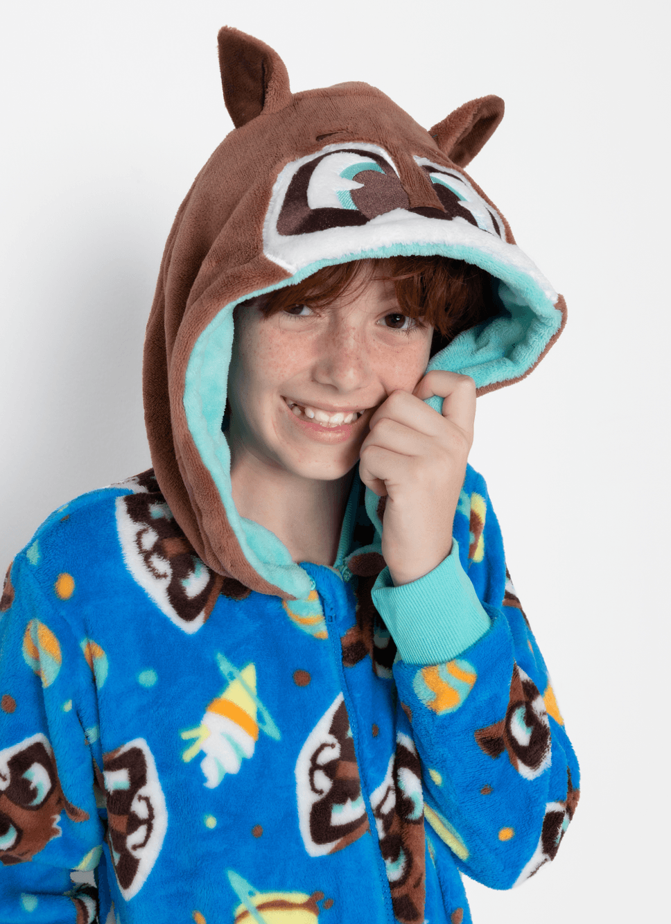 Macacão em coral fleece com estampa do Guaxinim Puket.