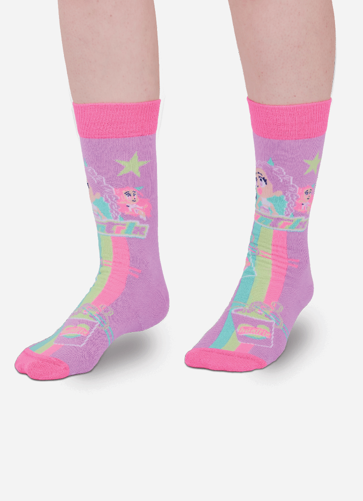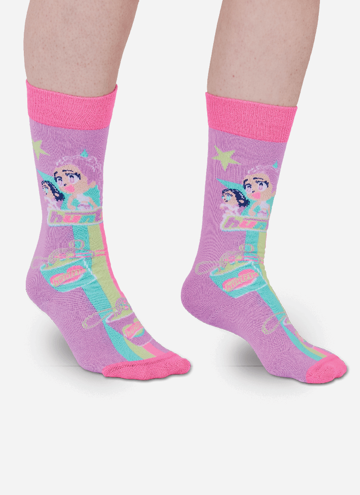 Meia 3/4 com desenho tema Guerreiras do K-pop, possui cano longo abaixo do joelho. É produzida com algodão macio em sua maior parte e poliamida nos desenhos Indicação de uso: Ideal para usar com calçados fechados. Instruções de Lavagem: Lavagem a mão Não alvejar Instruções de Conservação: Não secar em tambor Não passar Não limpar a seco (MAIS INFORMAÇÕES, VIDE NA ETIQUETA) Instruções de Garantia: Deverá ser encaminhado dentro na embalagem original, sem indicações de uso ACOMPANHADO DE NOTA FISCAL E com todos os itens constante na solicitação da compra.