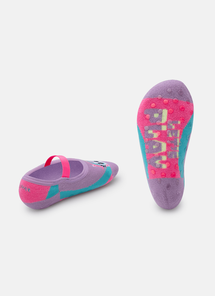 Meia com modelagem de sapatilha no tema unicórnio. Produzida com algodão macio, fio de acrílico e poliamida no desenho. Possui acabamento em viés e elástico confortável. Solado com antiderrapante com aroma de morango. Indicação de uso: Ideal para praticar exercícios e brincadeiras sem o uso de calçado e no dia a dia em casa. Instruções de Lavagem: Lavagem a mão Não alvejar Instruções de Conservação: Não secar em tambor Não passar Não limpar a seco (MAIS INFORMAÇÕES, VIDE NA ETIQUETA) Instruções de Garantia: Deverá ser encaminhado dentro na embalagem original, sem indicações de uso ACOMPANHADO DE NOTA FISCAL E com todos os itens constante na solicitação da compra.