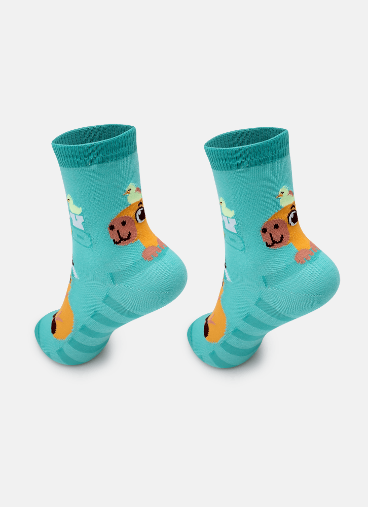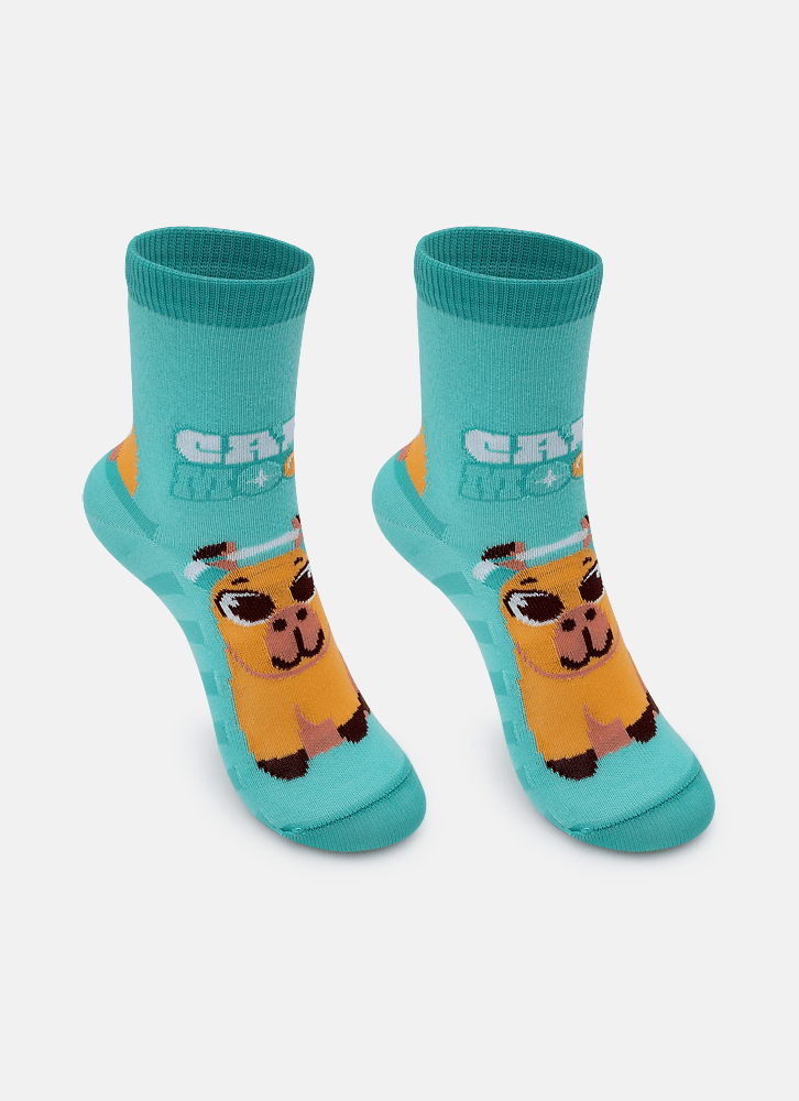 Meia soquete com desenho divertido de capivara. Possui cano de altura média. Produzida com algodão macio em sua maior parte, e poliamida no desenho. Indicação de uso: Ideal para usar com calçados fechados. Instruções de Lavagem: Lavagem a mão Não alvejar Instruções de Conservação: Não secar em tambor Não passar Não limpar a seco (MAIS INFORMAÇÕES, VIDE NA ETIQUETA) Instruções de Garantia: Deverá ser encaminhado dentro na embalagem original, sem indicações de uso ACOMPANHADO DE NOTA FISCAL E com todos os itens constante na solicitação da compra.