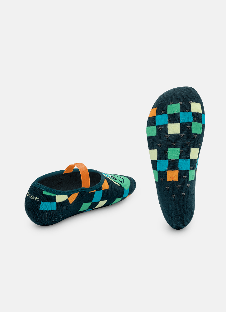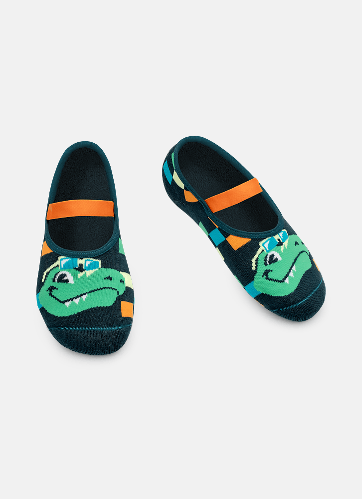 'Meia sapatilha desenhada tema dino. Produzida com algodão macio e desenho em poliamida. Possui acabamento em viés e elástico confortável. Solado com antiderrapante com aroma de menta. Indicação de uso: Ideal para praticar exercícios e brincadeiras sem o uso de calçado e no dia a dia em casa. Instruções de Lavagem: Lavagem a mão Não alvejar Instruções de Conservação: Não secar em tambor Não passar Não limpar a seco (MAIS INFORMAÇÕES, VIDE NA ETIQUETA) Instruções de Garantia: Deverá ser encaminhado dentro na embalagem original, sem indicações de uso ACOMPANHADO DE NOTA FISCAL E com todos os itens constante na solicitação da compra.'