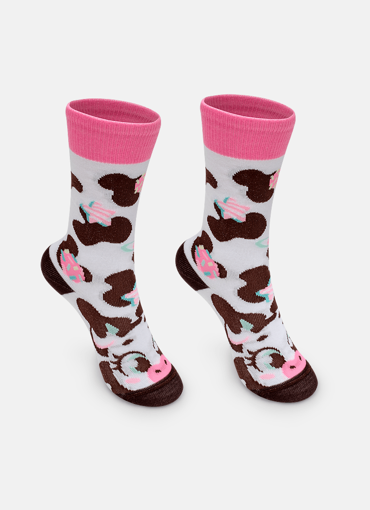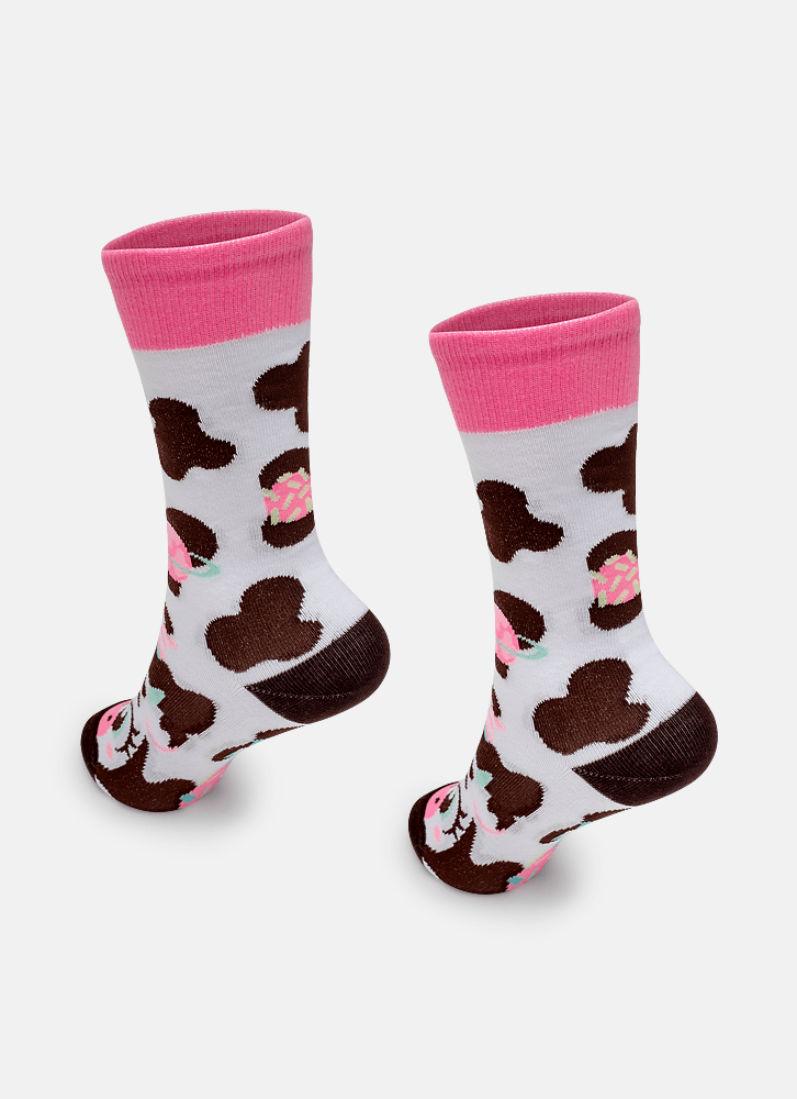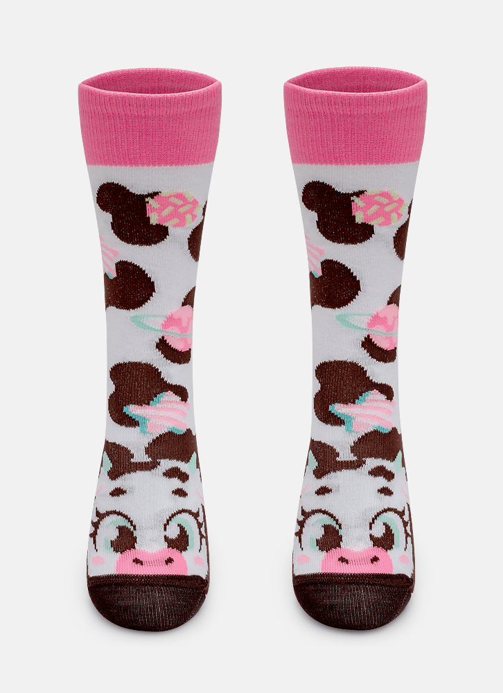 Meia 3/4 com desenho tema Vaca Universo Chocolate possui cano longo abaixo do joelho. É produzida com algodão macio em sua maior parte e poliamida nos desenhos. Indicação de uso: Ideal para usar com calçados fechados. Instruções de Lavagem: Lavagem a mão Não alvejar Instruções de Conservação: Não secar em tambor Não passar Não limpar a seco (MAIS INFORMAÇÕES, VIDE NA ETIQUETA) Instruções de Garantia: Deverá ser encaminhado dentro na embalagem original, sem indicações de uso ACOMPANHADO DE NOTA FISCAL E com todos os itens constante na solicitação da compra.
