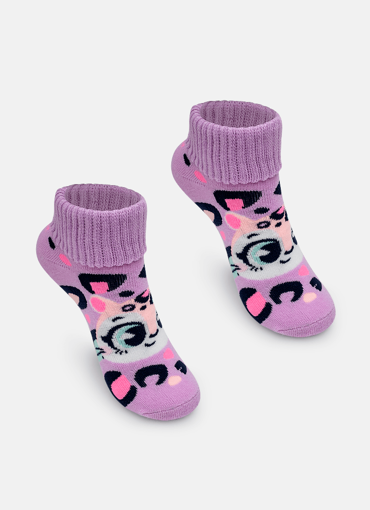'A meia com modelagem botinha atoalhada com desenho divertido do tema Onça Fantástico É produzida com algodão macio em sua maior parte e poliamida no desenho possui cano confortável e dobrável. Solado com antiderrapante transparente. Indicação de uso: Sem o uso de calçados e no dia a dia, tornando seus dias mais quentinhos. Instruções de Lavagem: Lavagem a mão Não alvejar Instruções de Conservação: Não secar em tambor Não passar Não limpar a seco (MAIS INFORMAÇÕES, VIDE NA ETIQUETA) Instruções de Garantia: Deverá ser encaminhado dentro na embalagem original, sem indicações de uso ACOMPANHADO DE NOTA FISCAL E com todos os itens constante na solicitação da compra.'