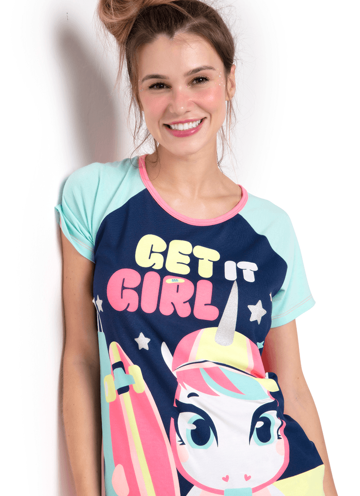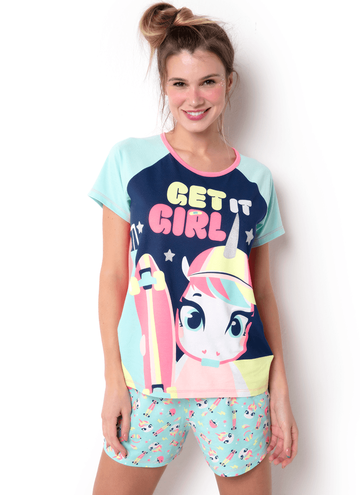Pijama Manga Curta Feminino Viscolycra Unicórnio Skate