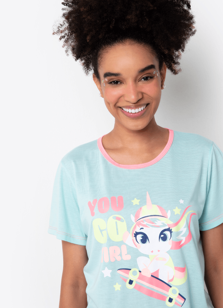 Pijama Longo Manga Curta Feminino Algodão Unicórnio Skate