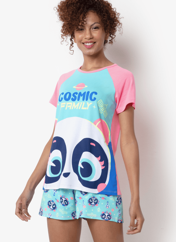 Pijama Manga Curta Viscolycra Feminino Família Panda