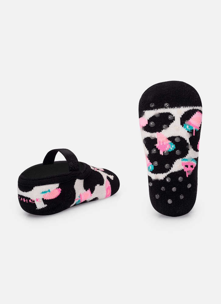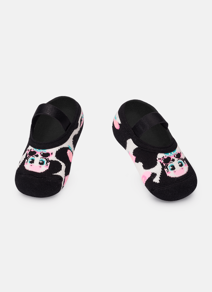 Meia com modelagem de sapatilha e desenho de vaca <3 Produzida com algodão macio, com a área do desenho em poliamida. Possui acabamento em viés e elástico confortável. Solado com antiderrapante. Ideal para praticar exercícios, brincadeiras sem o calçado e uso no dia a dia. Cuidados: Lavar a mão, não alvejar; não secar em tambor, não passar e não limpar a seco. Para mais informações, vide a etiqueta. Garantia: Deve ser encaminhado dentro da embalagem original, acompanhado da nota fiscal e com todos os itens constante na solicitação da compra.
