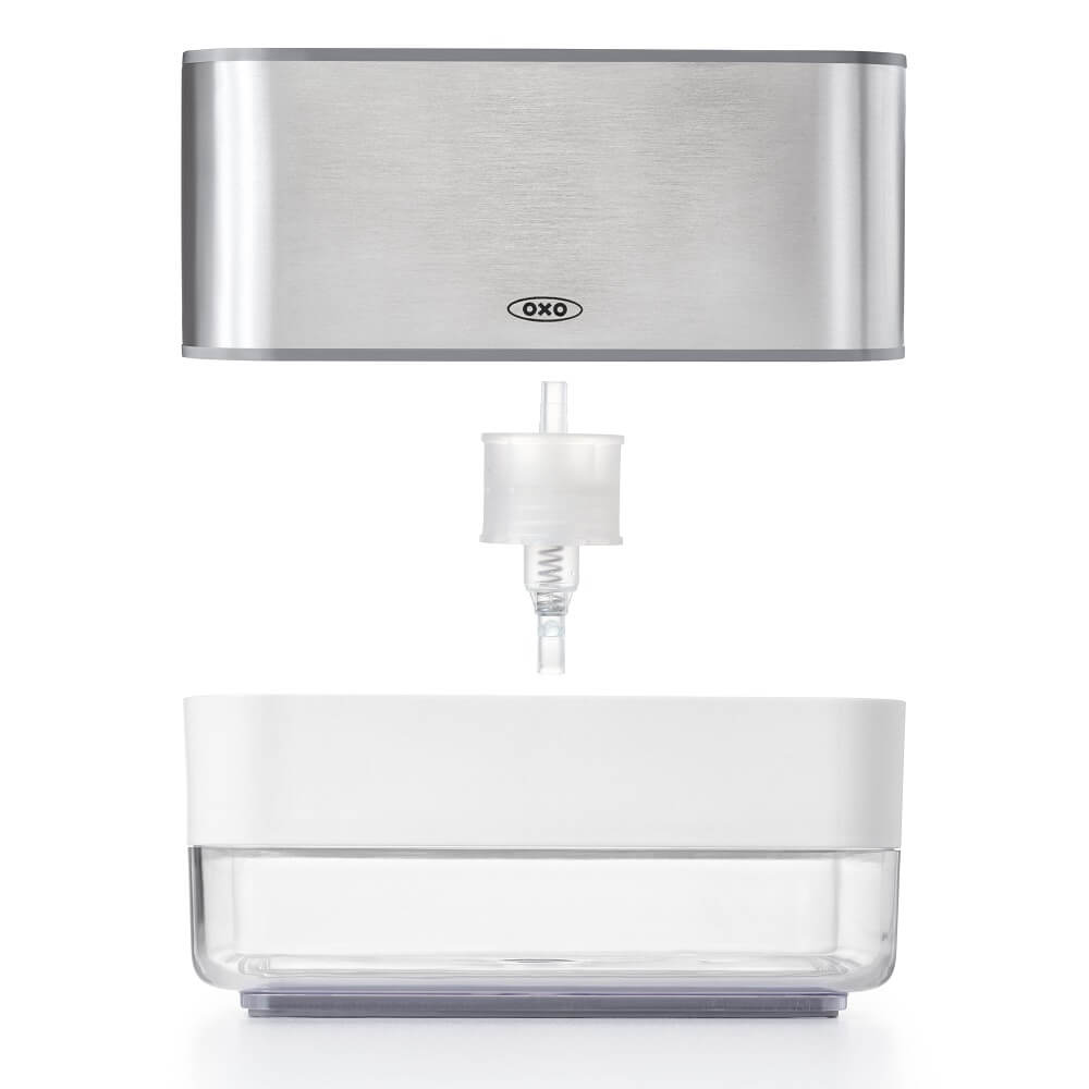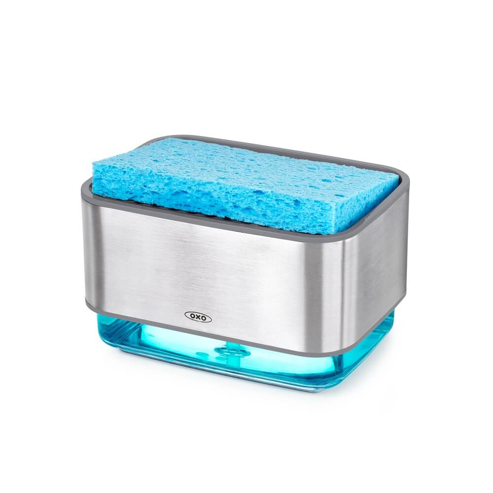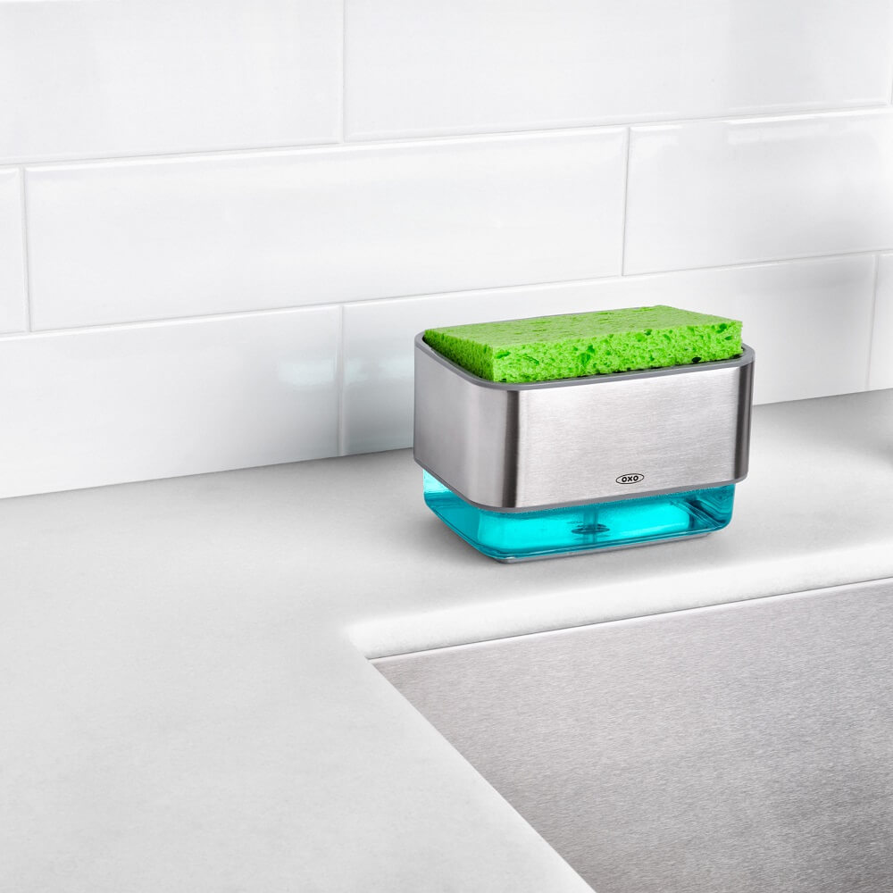 Acabe com os frascos de sabão bagunçados em sua bancada com o porta esponja e dispenser de sabonete OXO Good Grips. Obtenha sabão necessário com um toque fácil usando apenas uma mão!