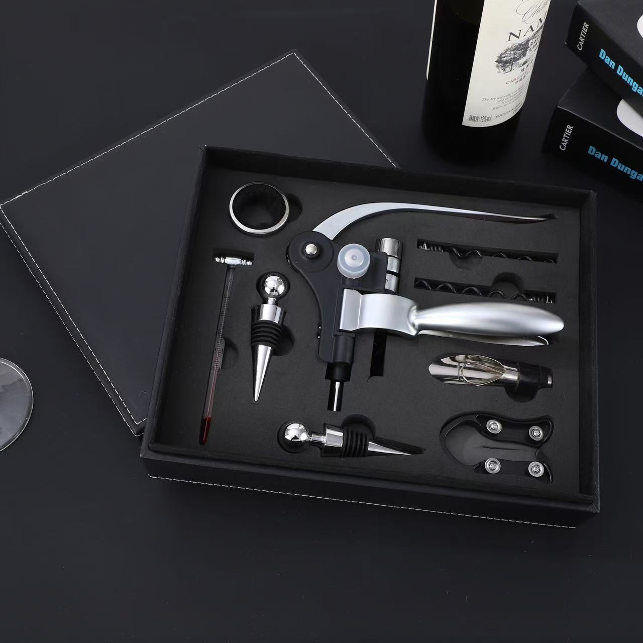 Este Kit Somellier possui uma linda Caixa de Armazenamento ou Presente, (1) um saca-rolhas e mais (8) oito acessórios considerados indispensáveis e mais utilizados por apreciadores de vinhos e Sommeliers.
