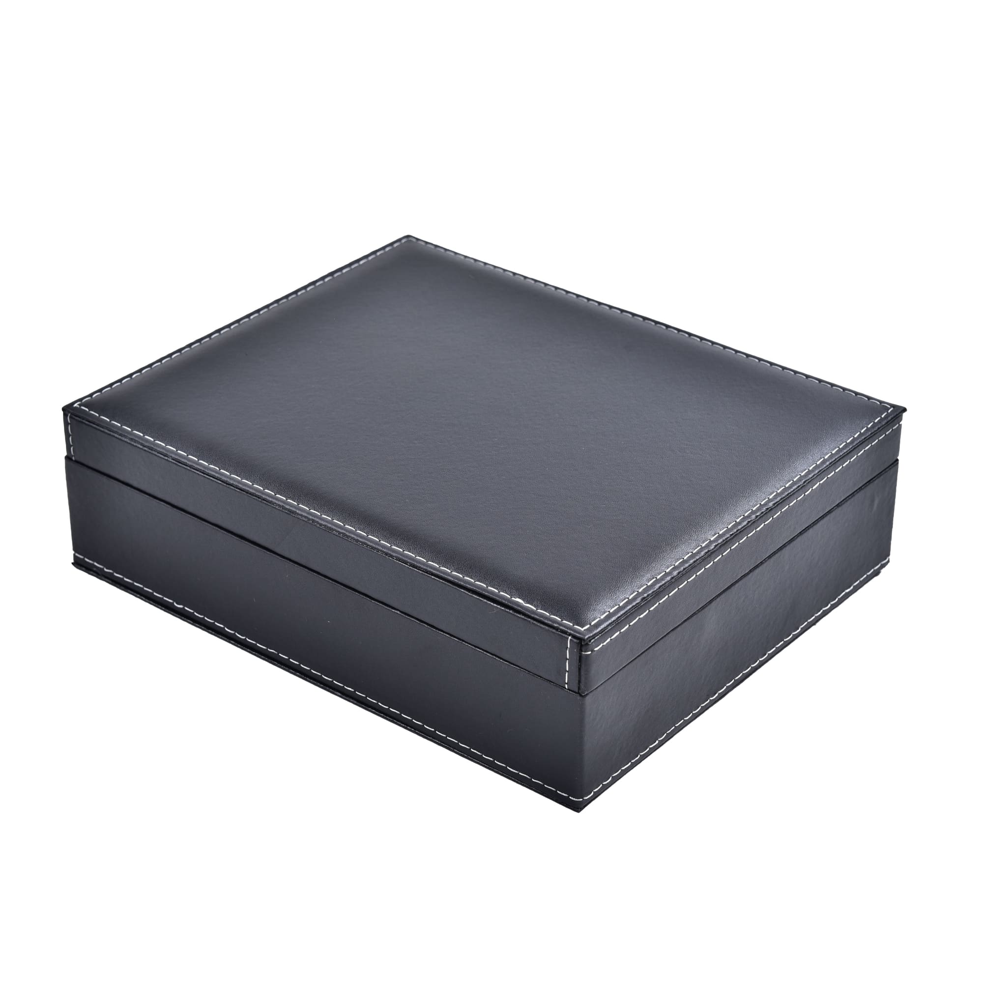 • Material: Aço Inox, Plástico, Vidro e Silicone e Caixa em Couro Sintético e MDF