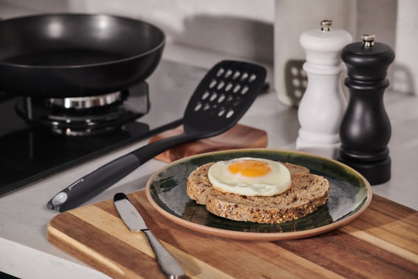 Fabricado em silicone resistente ao calor, suporta altas temperaturas sem manchar ou reter odores. Suas alças integradas facilitam o manuseio na frigideira, e a limpeza é prática, podendo ser lavado na máquina de lavar louças.