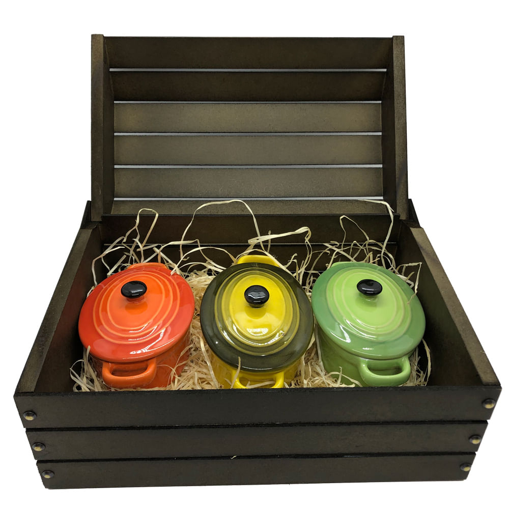 Panelinhas Amarela, Verde, Laranja de Porcelana OVAL com Bau rustico