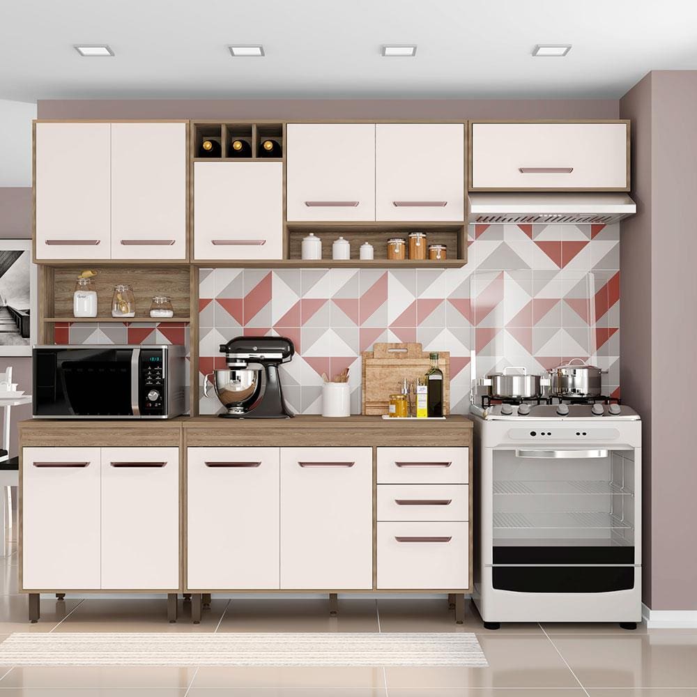 Cozinha Compacta Poliman Barcelona com Balcão, 11 Portas, 2 Gavetas, Nicho e Adega para 3 Garrafas - 258cm de largura