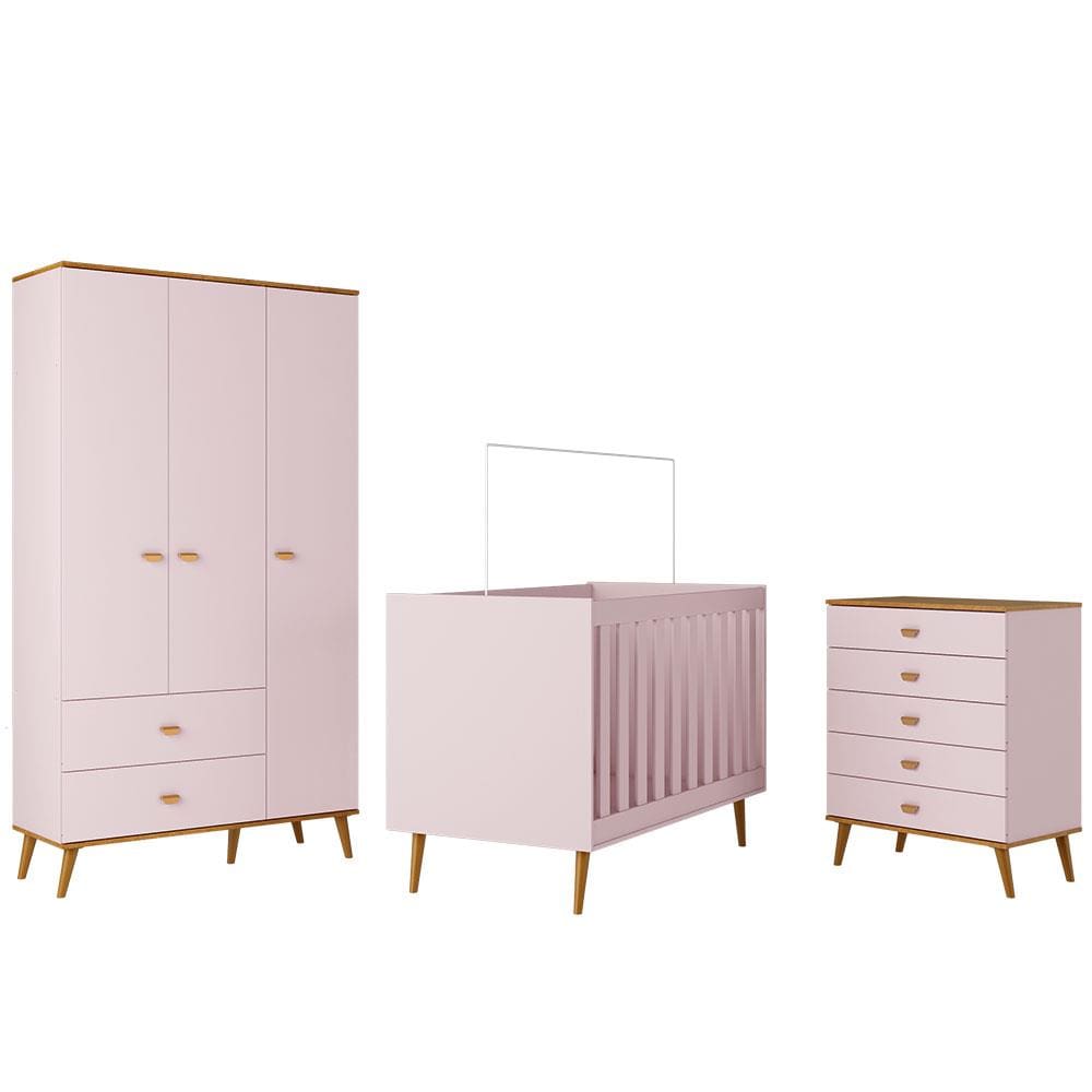 Guarda-Roupa Bartira Ternura com 3 Portas, 2 Gavetas + Cômoda Ternura com 5 Gavetas + Berço Móveis Estrela Ternura