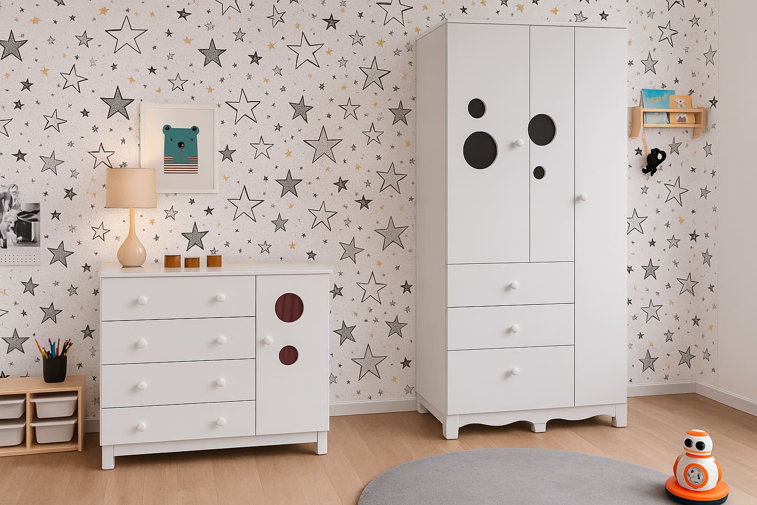 A cômoda conta com gavetas espaçosas e uma porta lateral com detalhes vazados divertidos, perfeitos para guardar roupas, fraldas, brinquedos e acessórios do dia a dia. Já o guarda-roupa complementa o ambiente com amplo espaço interno, cabideiro, prateleiras e portas com recortes lúdicos que encantam crianças e adultos.