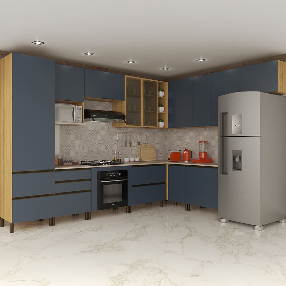 Conteúdo da Embalagem: -Cozinha Completa de Canto Bartira Cristal com 12 Portas, 7 Gavetas, 13 Prateleiras, 3 Nichos e 340cm de largura - Lâmina Mel/Azul Royal;