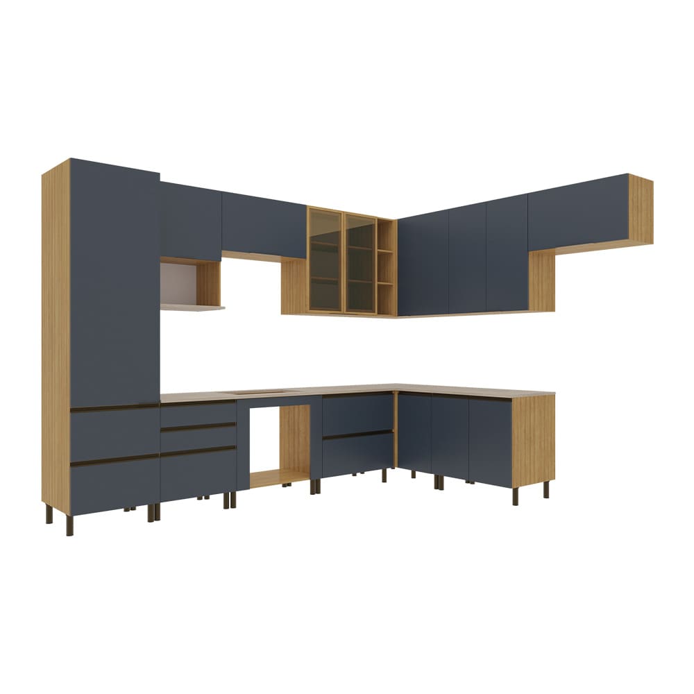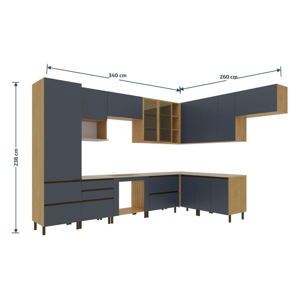 Cozinha Completa de Canto Bartira Cristal com 12 Portas, 7 Gavetas, 13 Prateleiras, 3 Nichos e 340cm de largura - Lâmina Mel/Azul Royal
