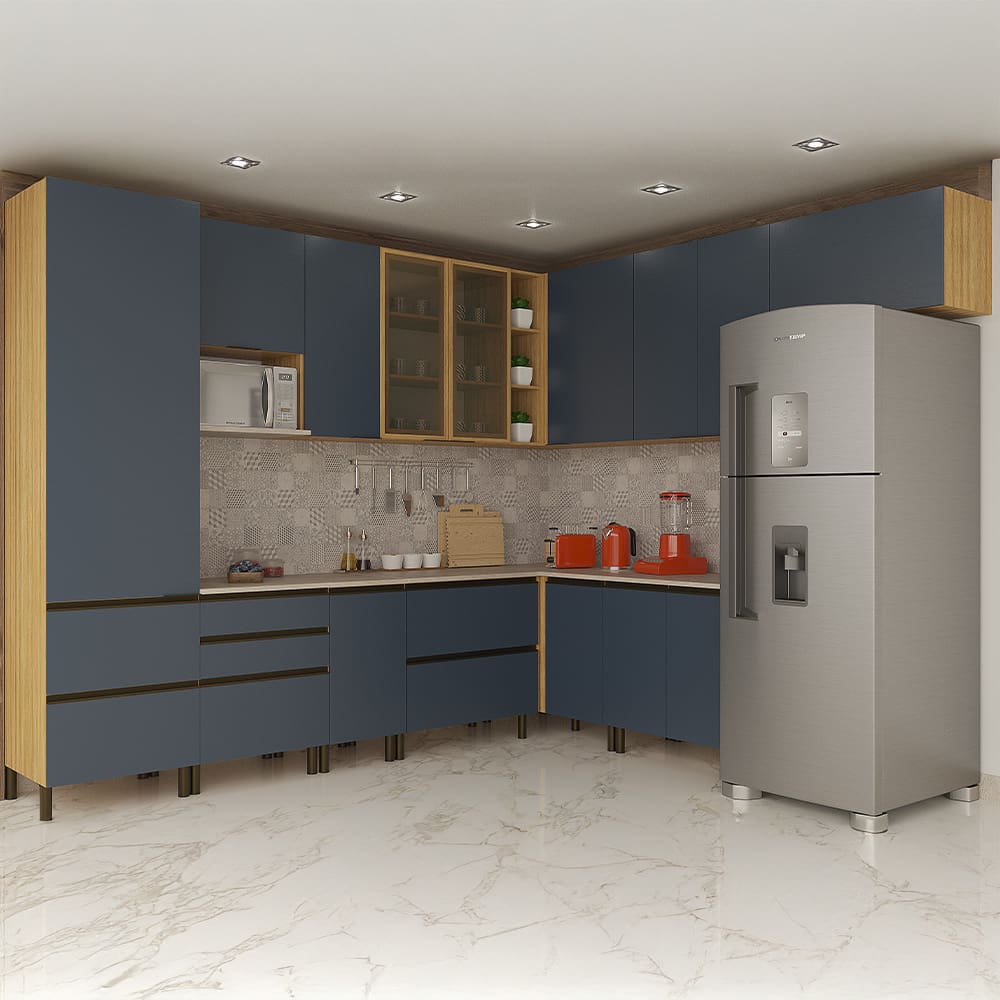 Conteúdo da Embalagem: -1 Cozinha Completa de Canto Bartira Cristal com 12 Portas, 9 Gavetas, 15 Prateleiras, 3 Nichos e 300cm de Largura - Lâmina Mel/Azul Royal;