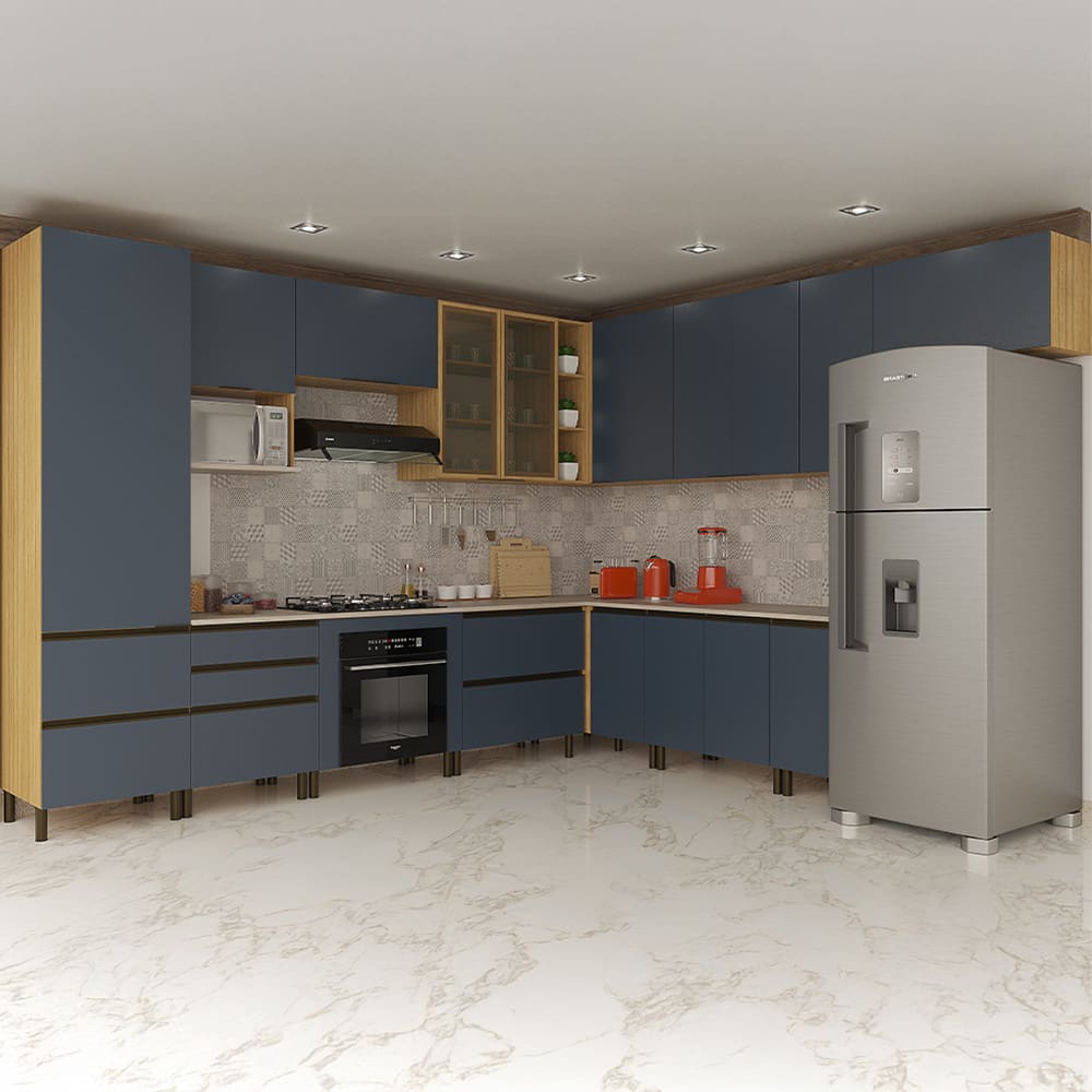Conteúdo da Embalagem: -Cozinha Completa Bartira Cristal 13 Portas, 9 Gavetas e 15 Prateleiras com 340cm de largura - Lâmina Mel/Azul Royal;
