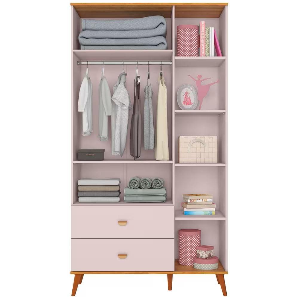 O Guarda-Roupa Infantil Bartira Ternura possui 2 portas, 2 gavetas com corrediças telescópicas, 5 nichos e 3 prateleiras internas, sendo uma móvel. Ideal para armazenar roupas dobradas, penduradas e acessórios, ele oferece amplo espaço interno e acabamento em MDP FF, garantindo durabilidade e resistência.