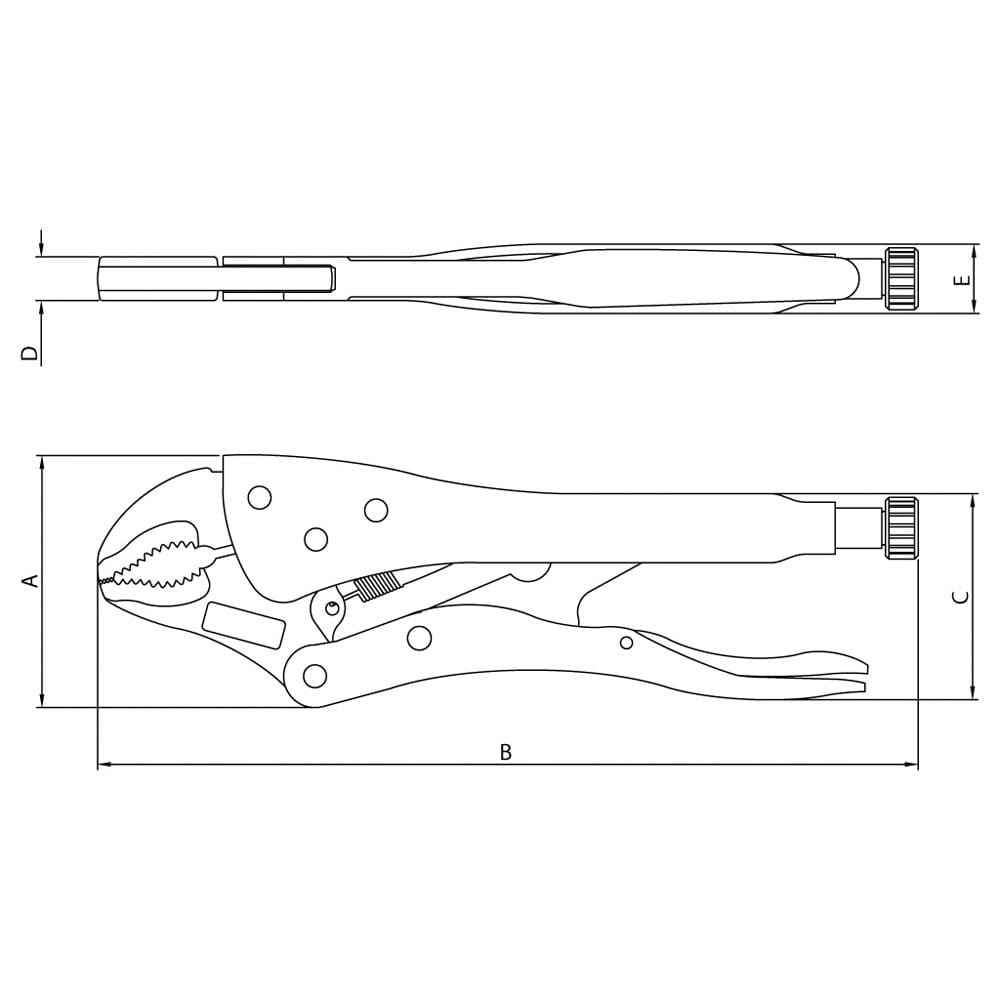 Características Gerais: • Mordentes forjados em aço especial e temperados • Corpo formado por chapas conformadas • Sistema de rebites especialmente projetado para aumentar a resistência do produto • Formato ergonômico para maior conforto • Mordentes curvo • Produzido e testado conforme normas específicas • Acabamento cromado • Abertura regulável • Possui alavanca para destravar • Suporte plástico • Tamanho: 10 polegadas Medidas (Croqui) Dimensão Extra A: 70,0 mm. Dimensão Extra B: 232,0 mm. Dimensão Extra C: 57,0 mm. Dimensão Extra D: 12,0 mm. Dimensão Extra E: 19,0 mm.