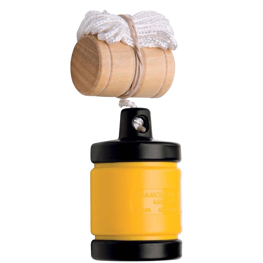 Material: Corpo em aço revestido por plástico + Calço guia de madeira + Cordão de náilon